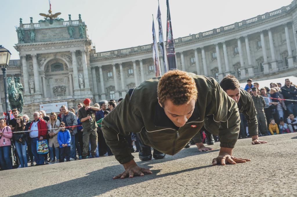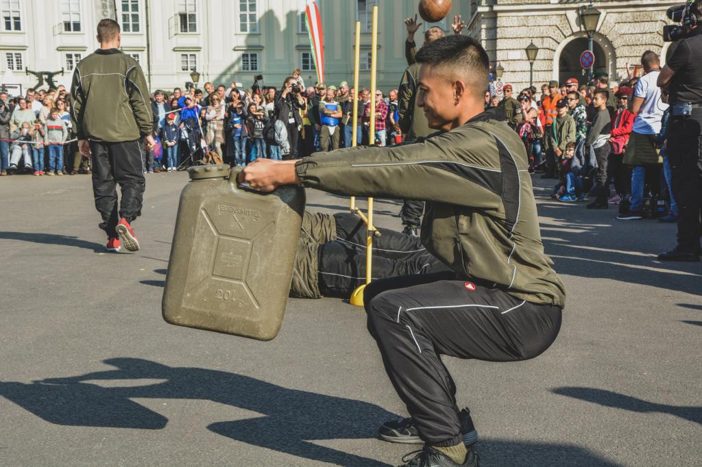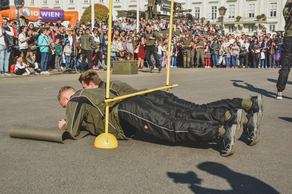 Auch die Garde beteiligte sich mit Einlagen im Showexerzieren (1. Gardekompanie) und einer Sportvorführung (2. Gardekompanie) an den heutigen Darbietungen im Rahmen des Nationalfeiertages am Heldenplatz. (goe)