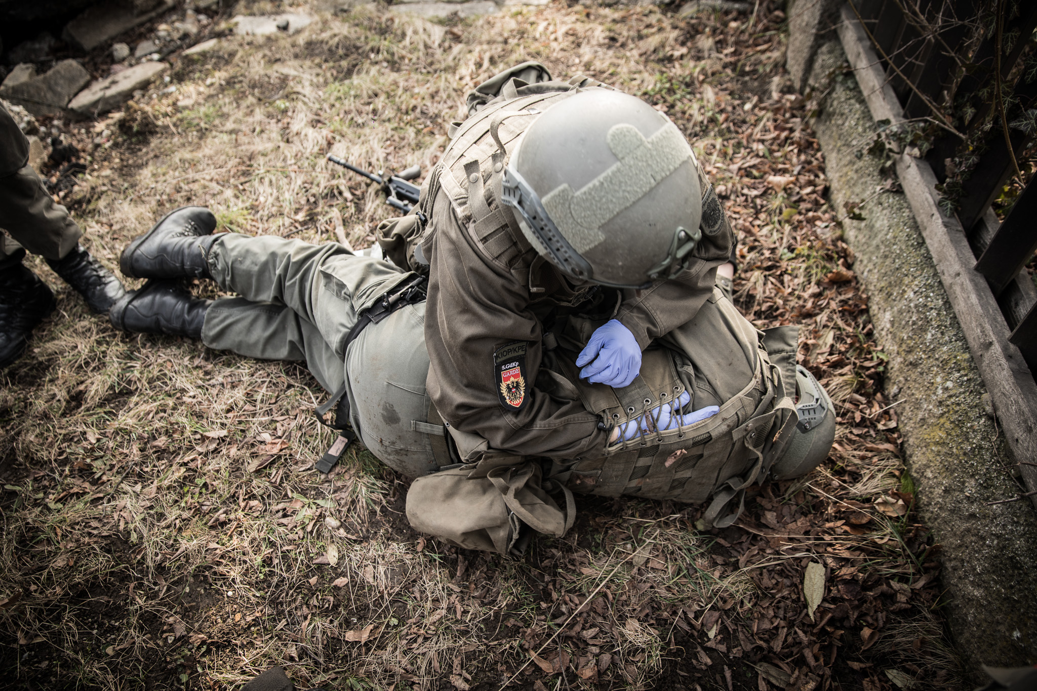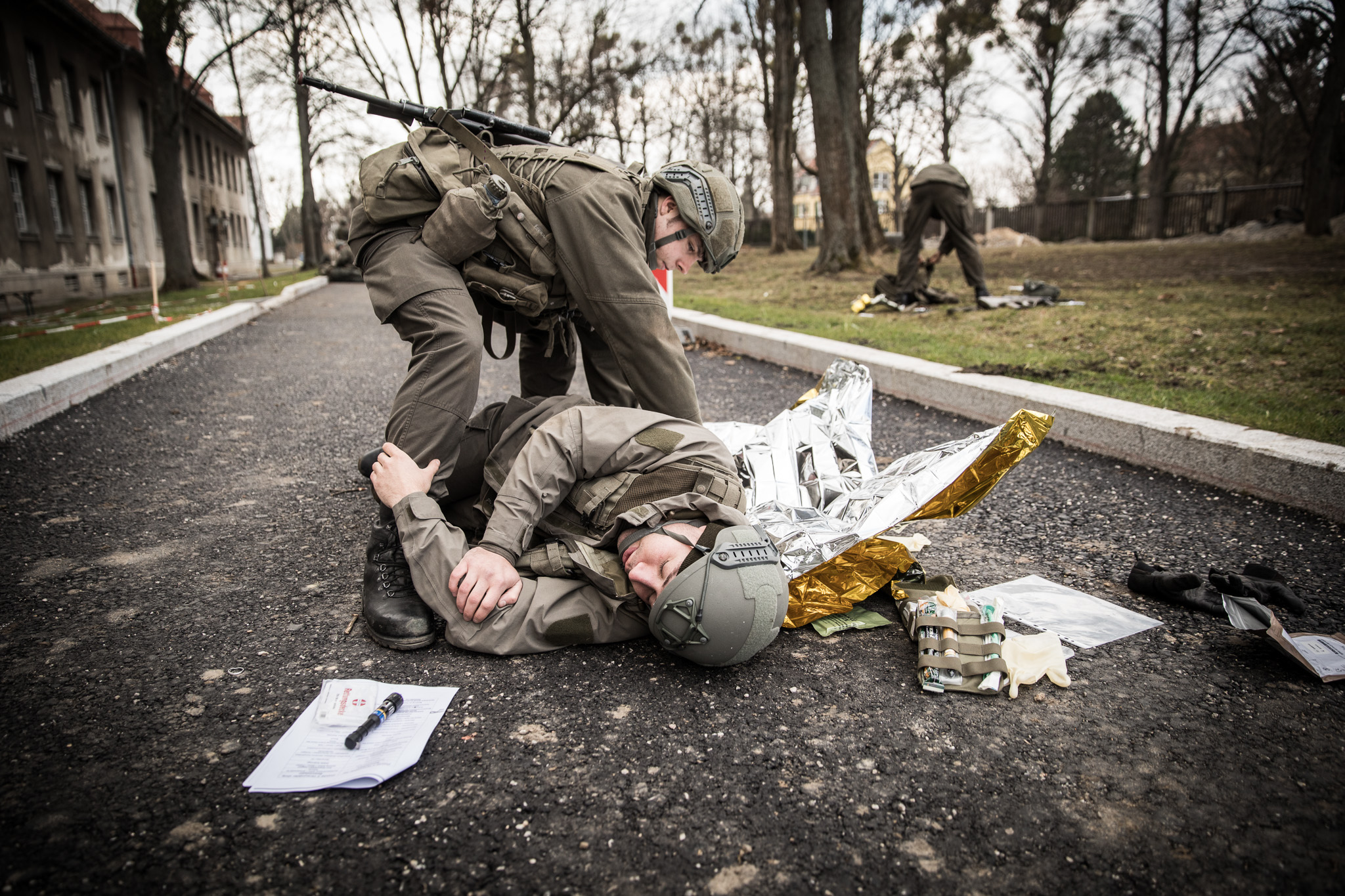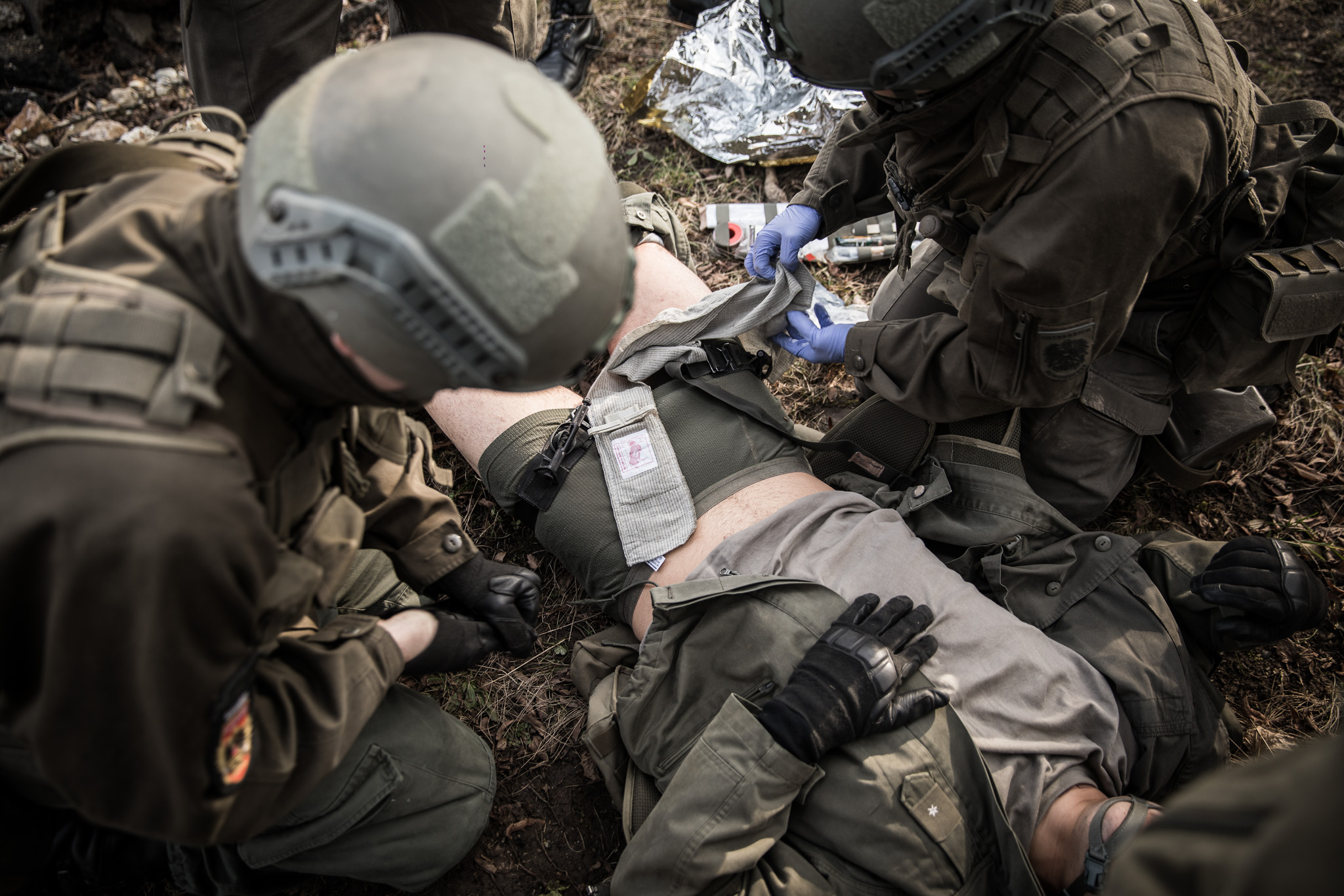 Ausbildung Erweiterte Selbst- und Kameradenhilfe zur Verwundetenversorgung am Gefechtsfeld durch die KPE-Soldaten der 5. Gardekompanie. Sie dienst zur Erlangung der Befähigung, jeweils situativ angemessene Maßnahmen zur Versorgung von Verwundeten Kameraden und Gefechtsbedingungen selbstständig anzuwenden.