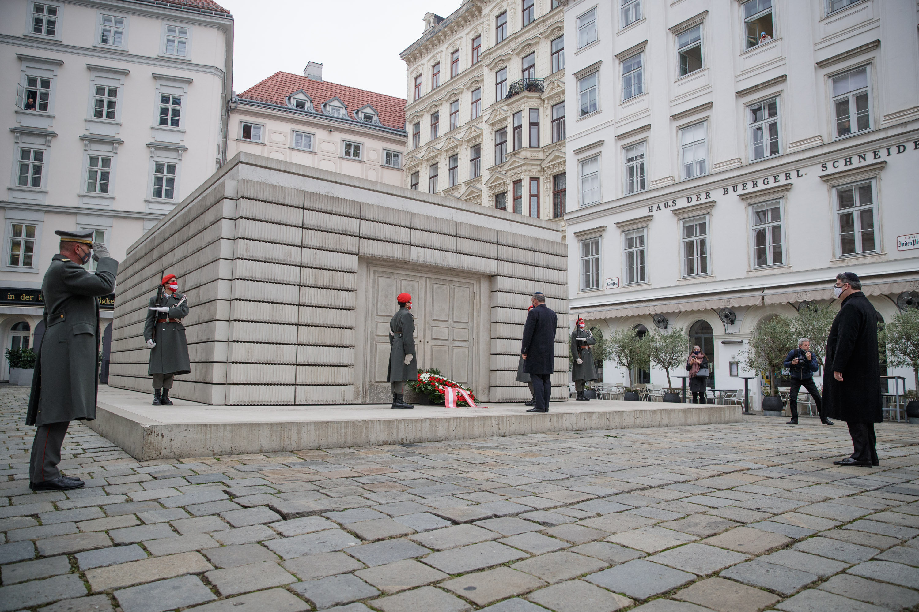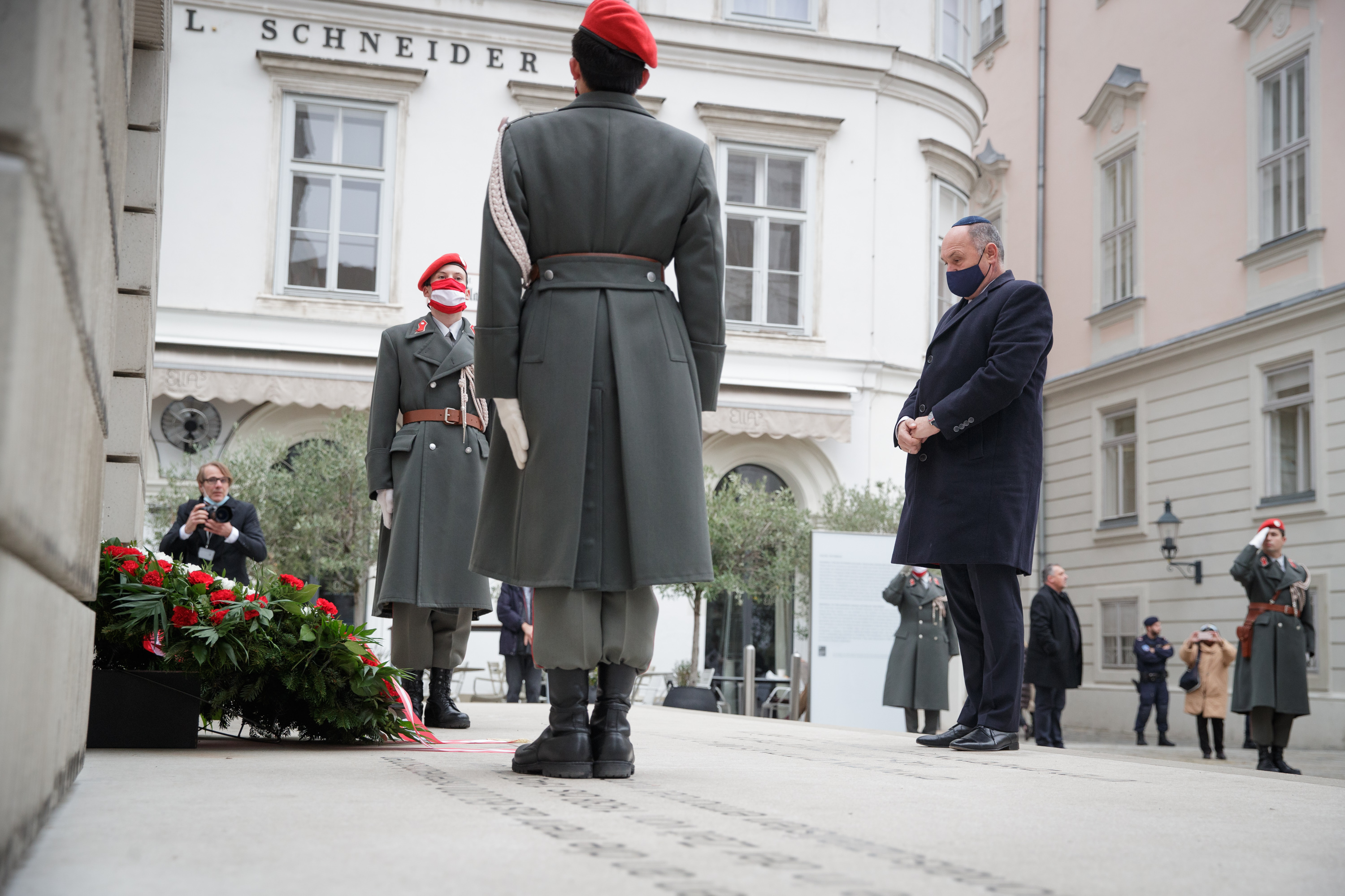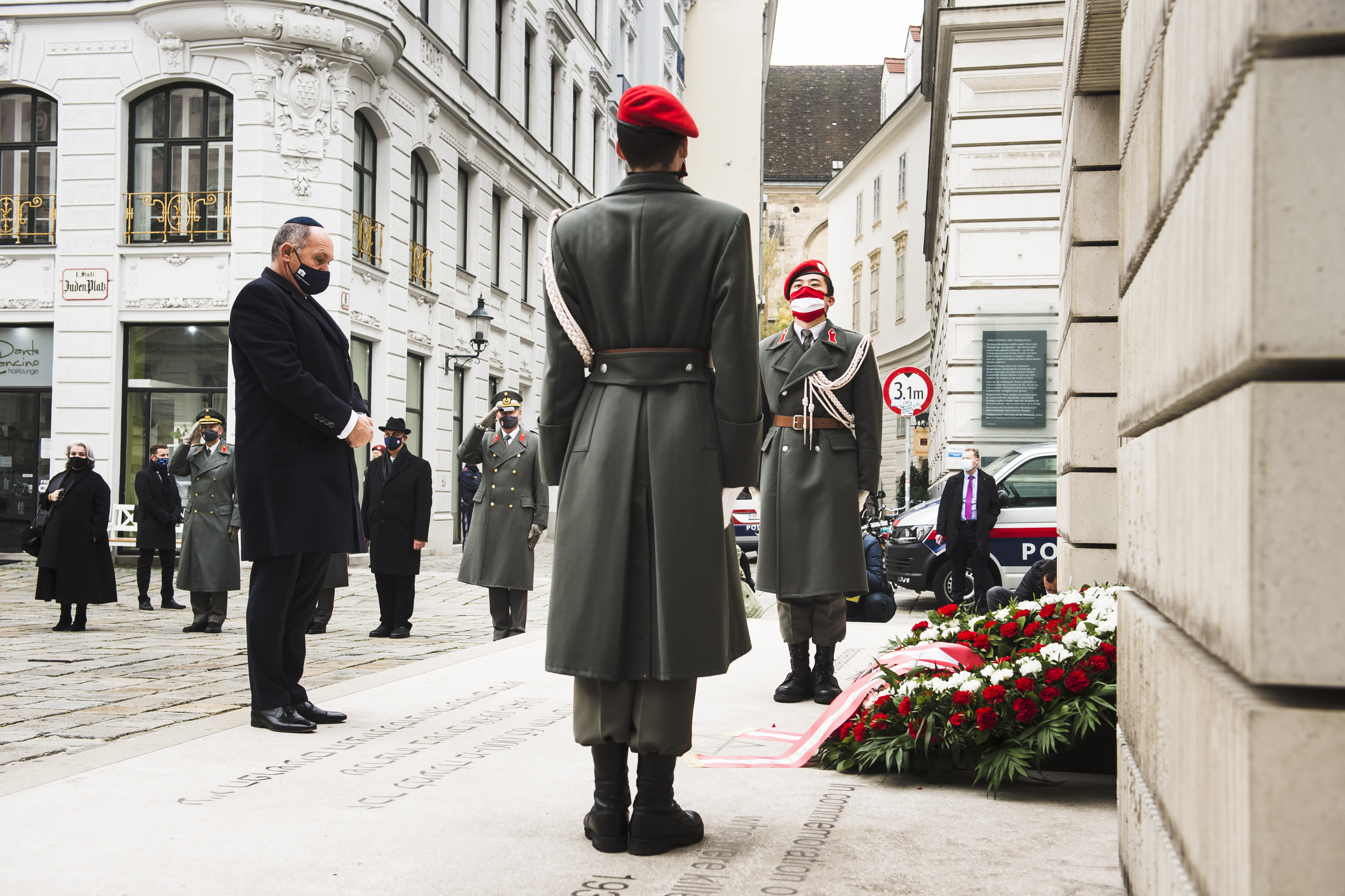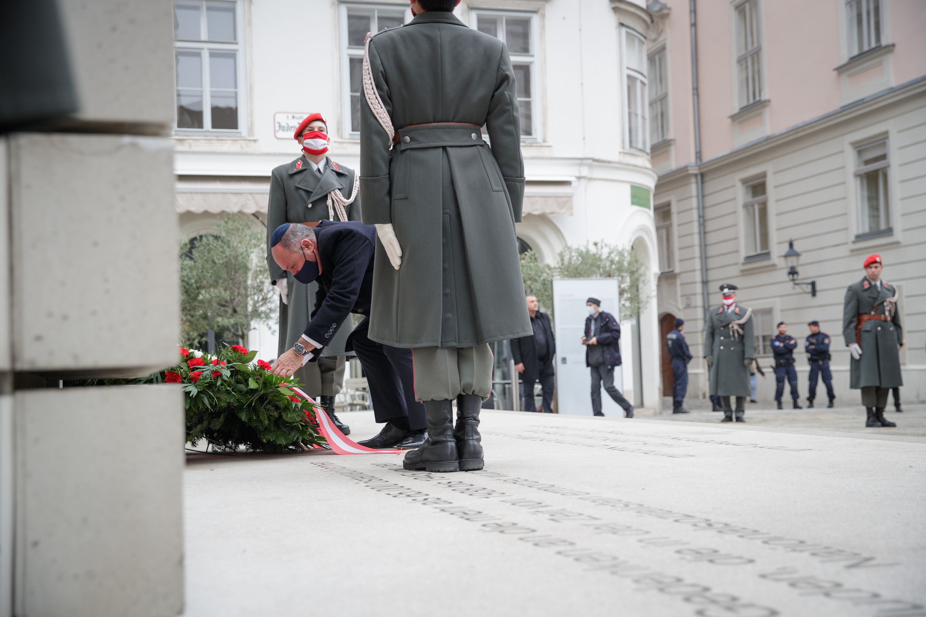 Anlässlich des 82. Jahrestages der Novemberpogrome legte Nationalratspräsident Wolfgang Sobotka, in Vertretung von Bundespräsident Alexander Van der Bellen, beim Mahnmal für die Opfer der Shoa am Judenplatz einen Kranz nieder. Die Garde unterstützte mit Ehrendiensten und einem Trompeter.(Foto: Peter Lechner/HBF)