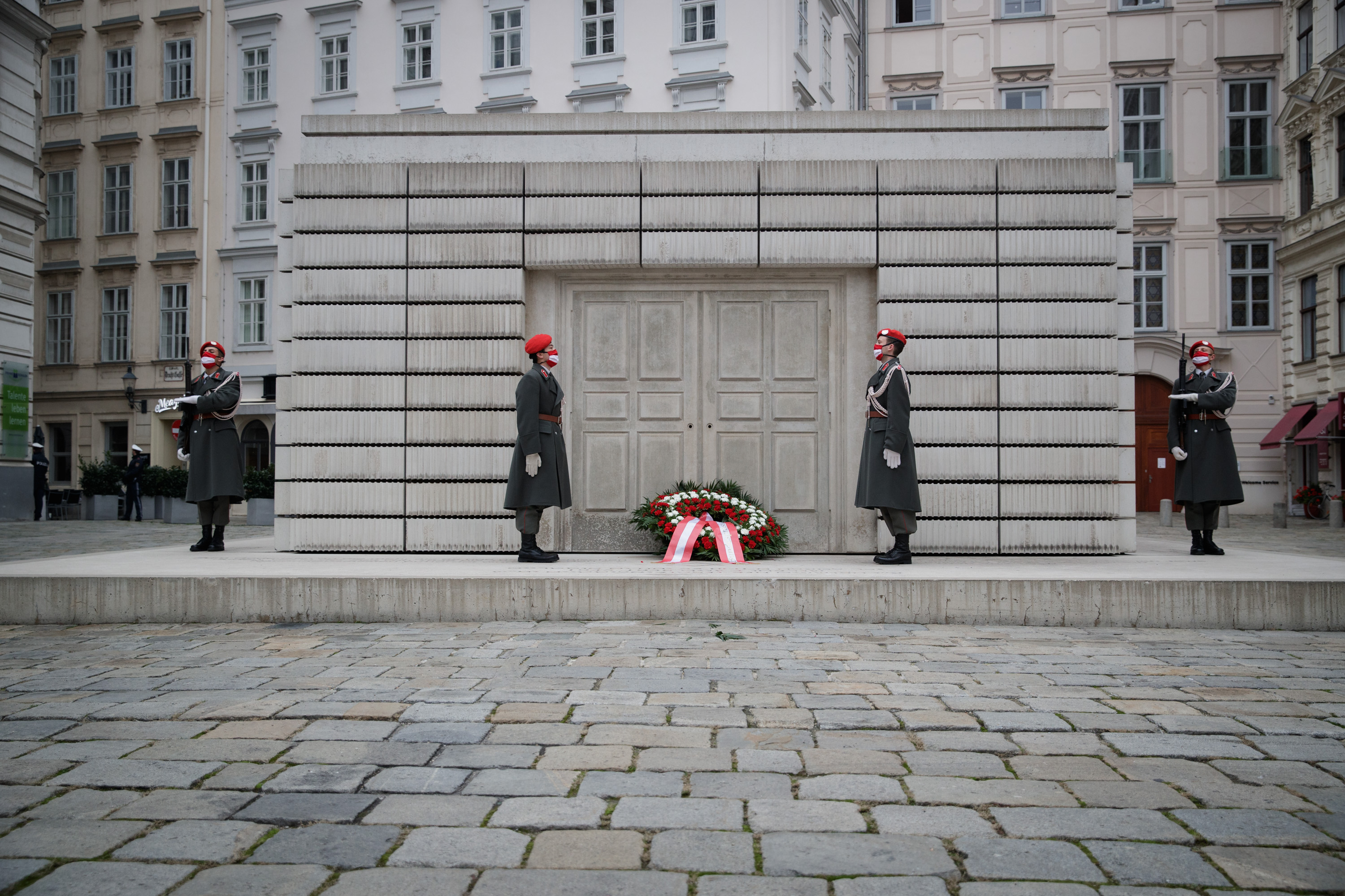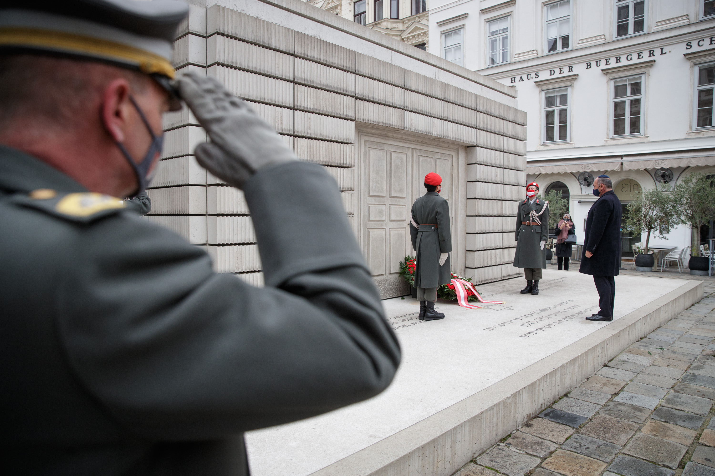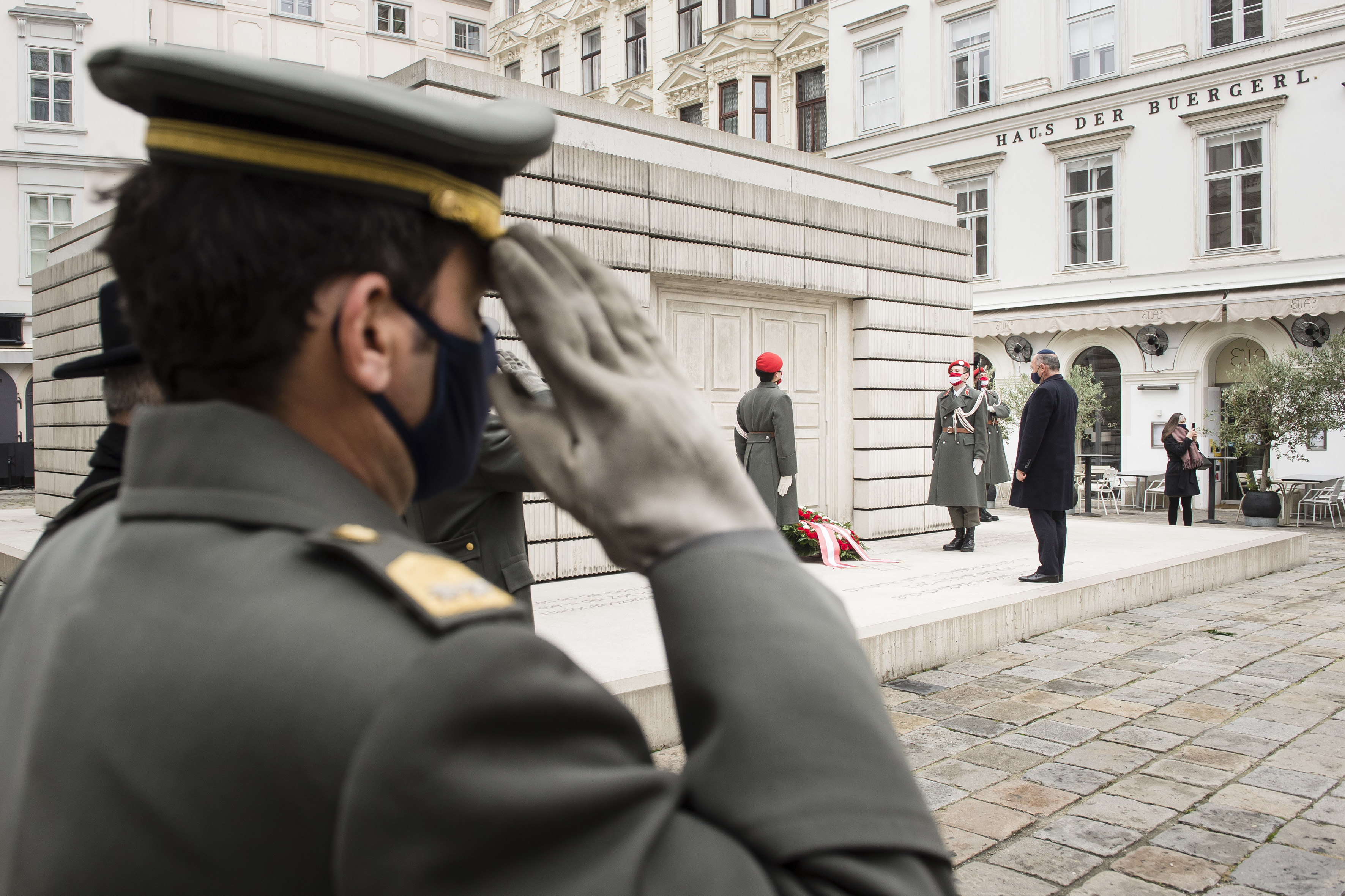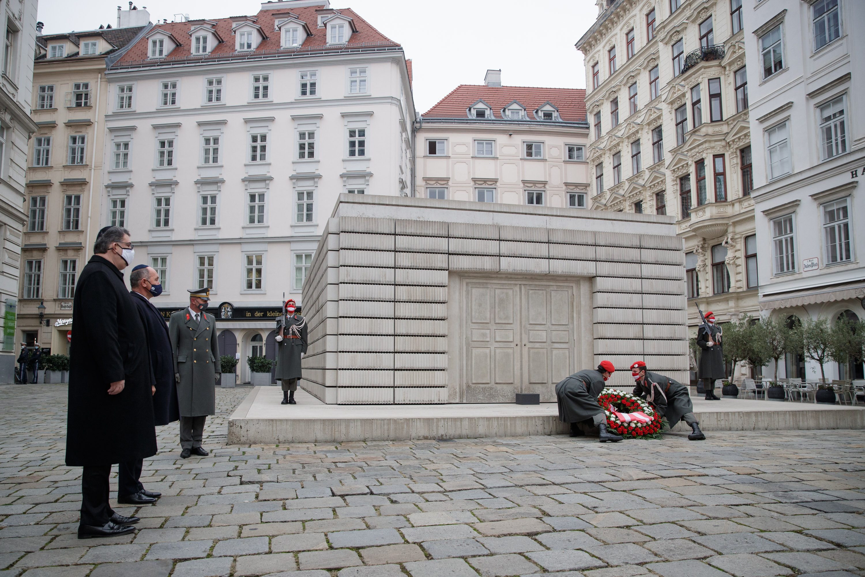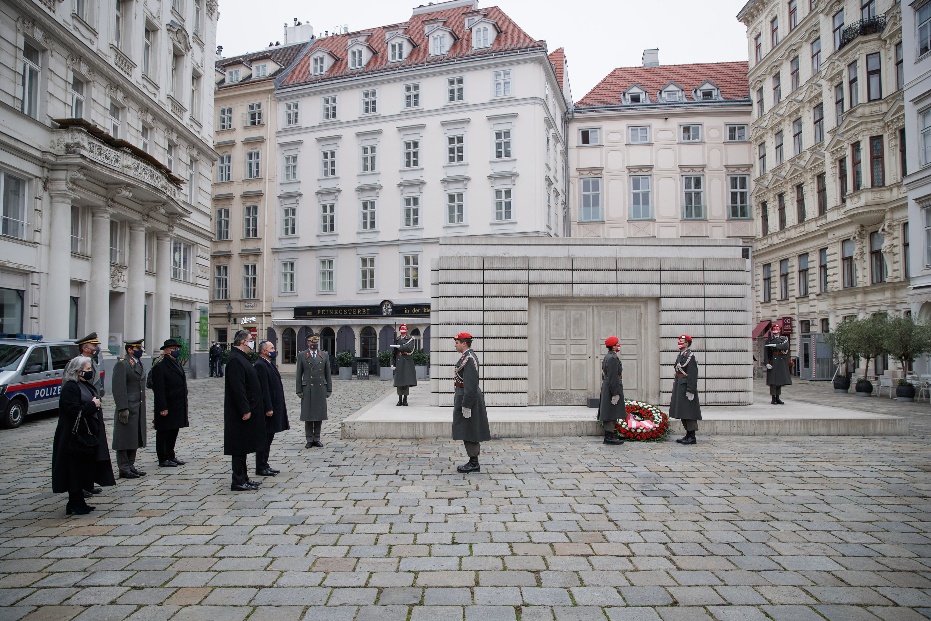 Anlässlich des 82. Jahrestages der Novemberpogrome legte Nationalratspräsident Wolfgang Sobotka, in Vertretung von Bundespräsident Alexander Van der Bellen, beim Mahnmal für die Opfer der Shoa am Judenplatz einen Kranz nieder. Die Garde unterstützte mit Ehrendiensten und einem Trompeter.(Foto: Peter Lechner/HBF)