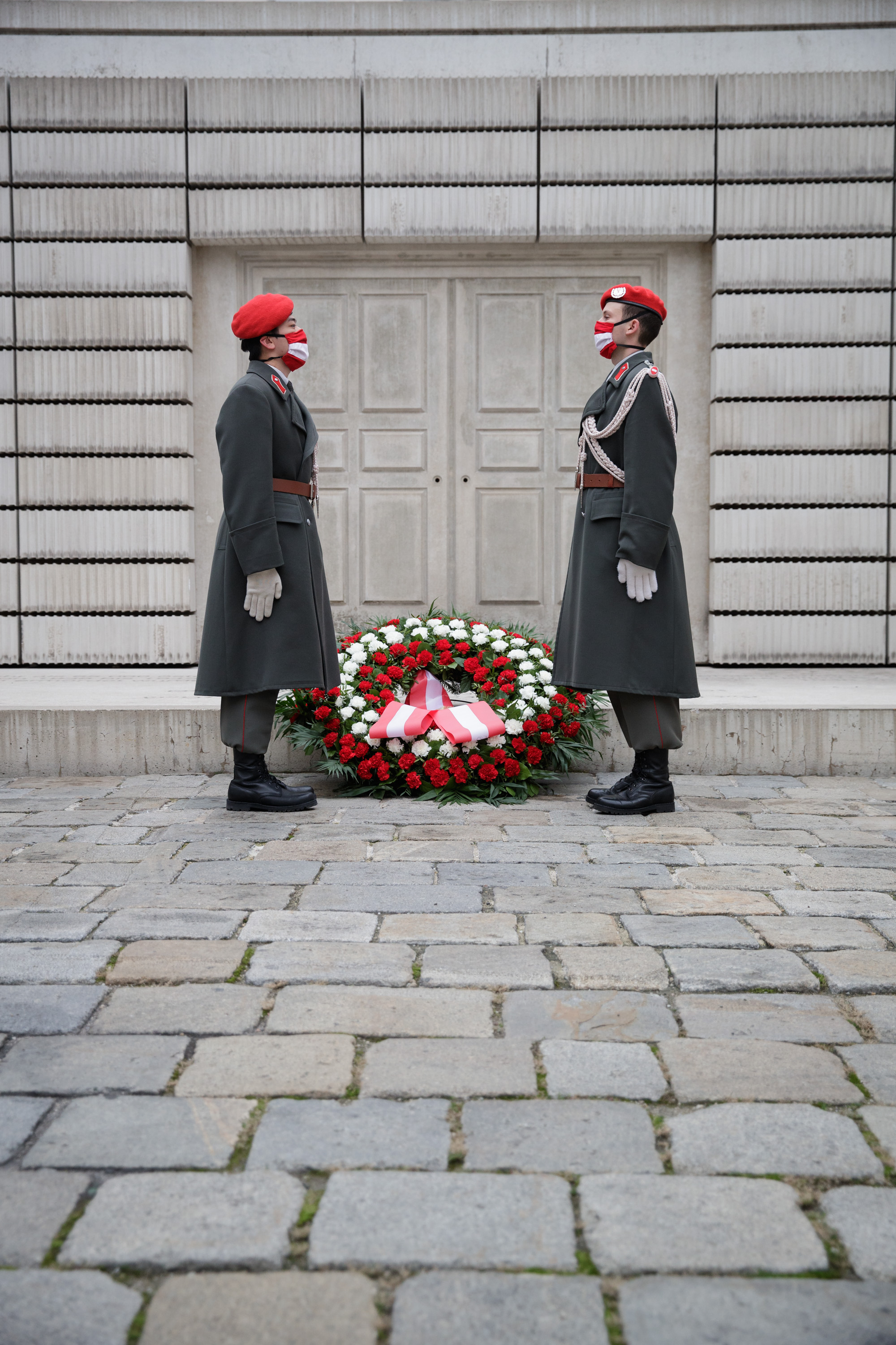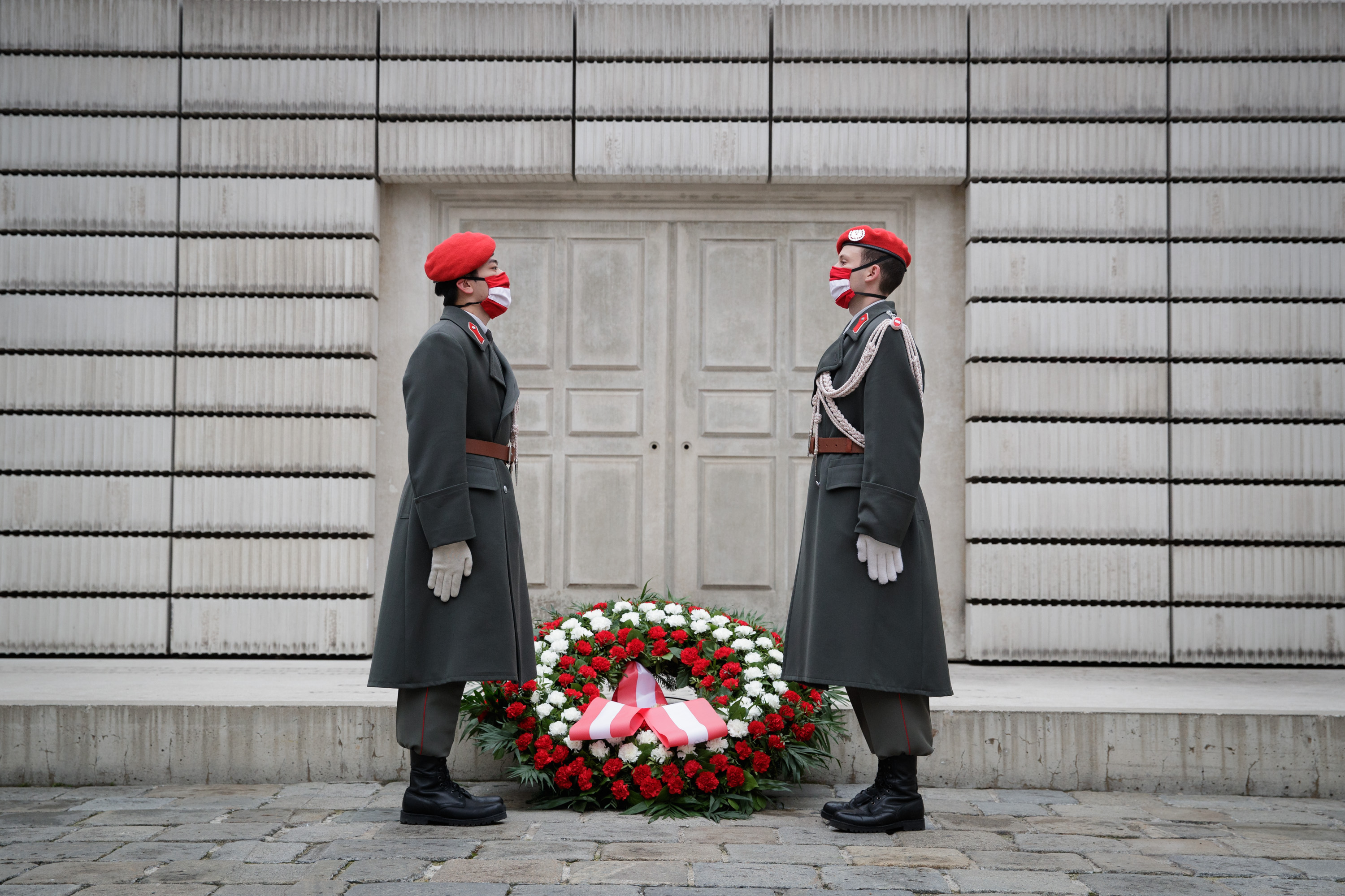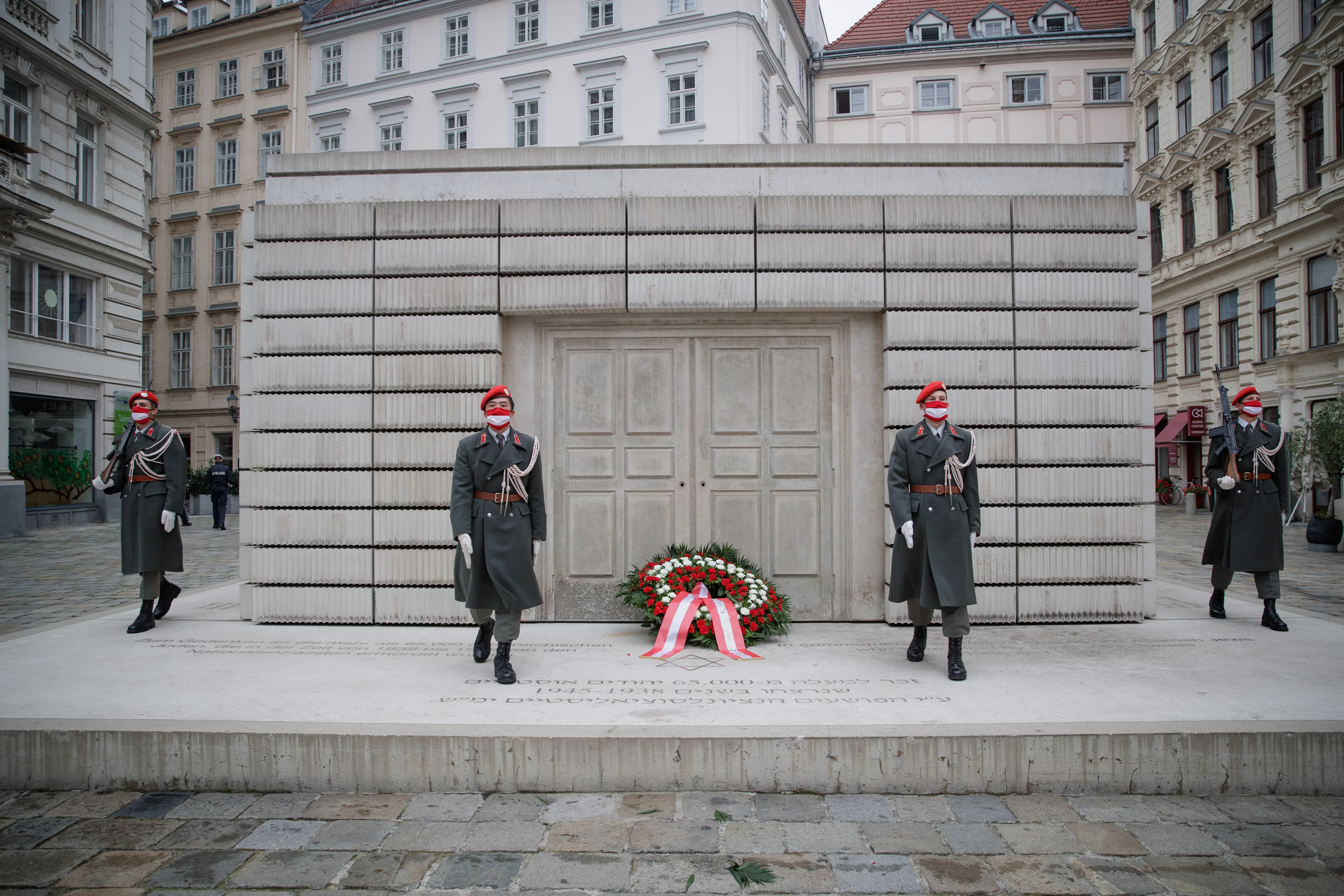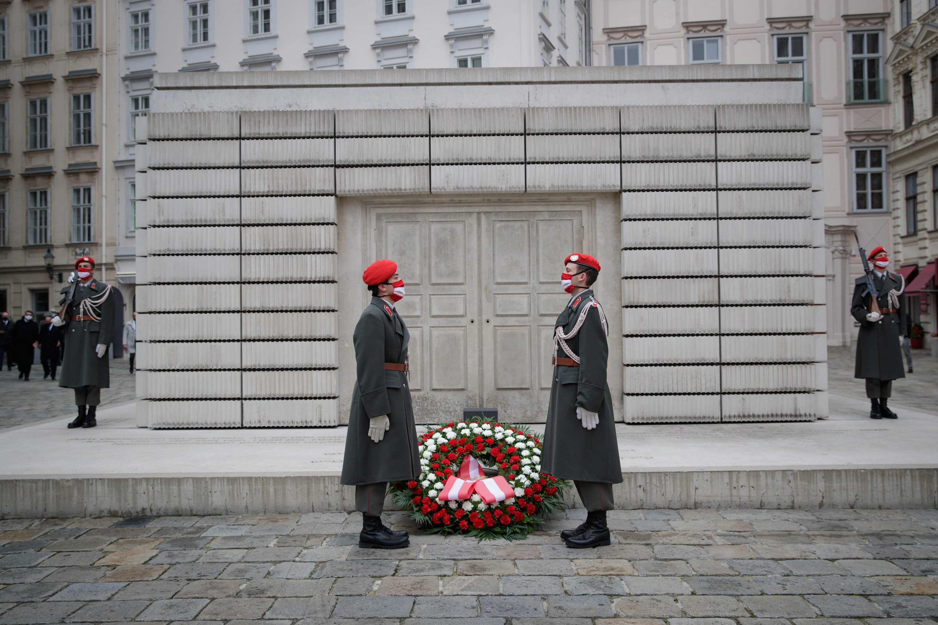 Anlässlich des 82. Jahrestages der Novemberpogrome legte Nationalratspräsident Wolfgang Sobotka, in Vertretung von Bundespräsident Alexander Van der Bellen, beim Mahnmal für die Opfer der Shoa am Judenplatz einen Kranz nieder. Die Garde unterstützte mit Ehrendiensten und einem Trompeter.(Foto: Peter Lechner/HBF)