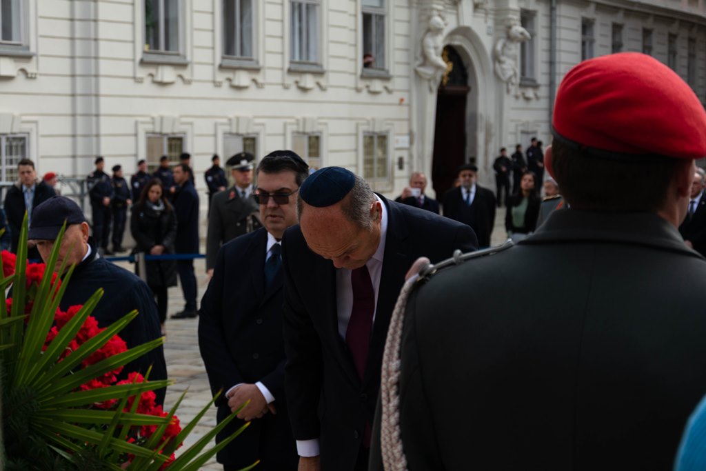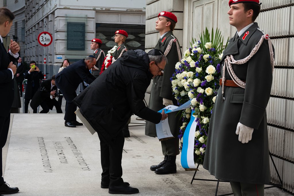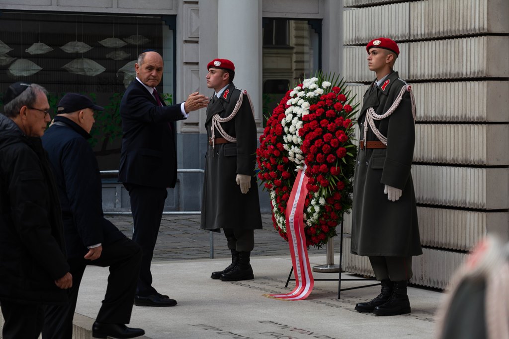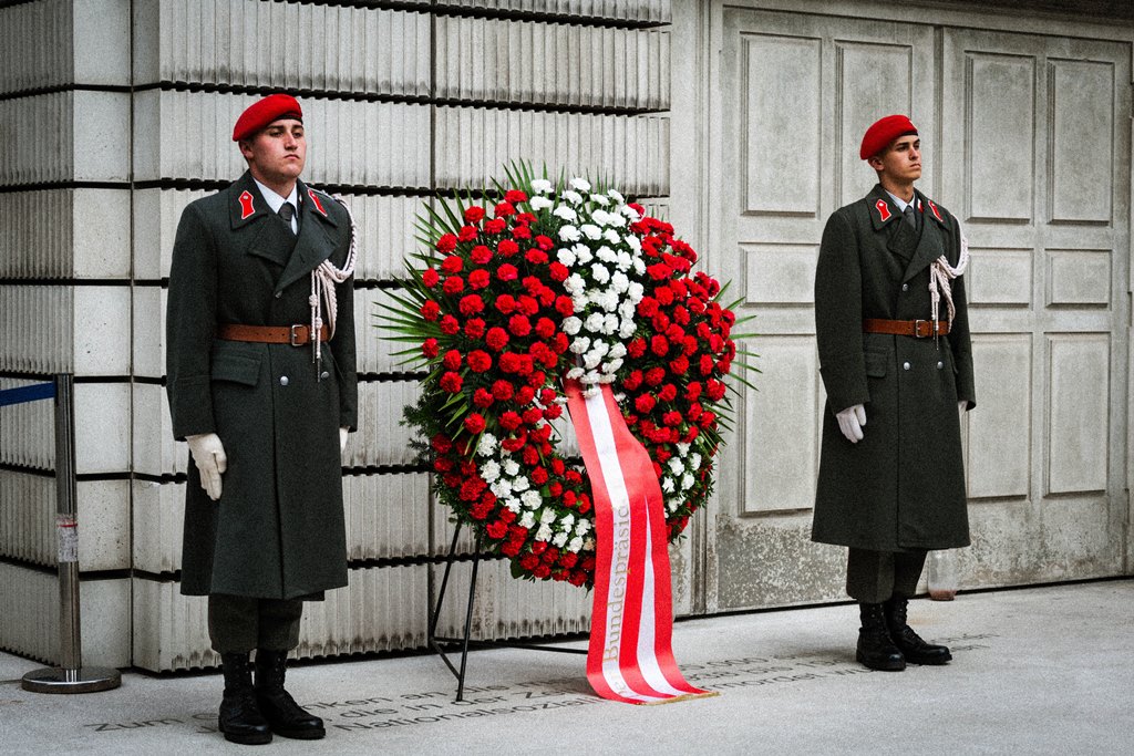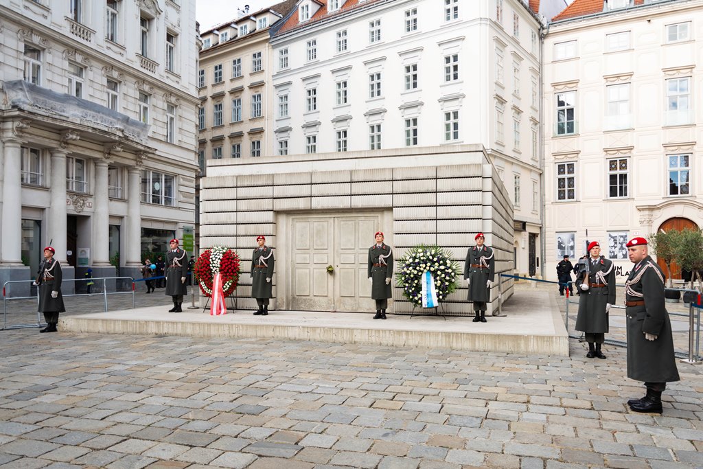 Anlässlich des 83. Jahrestages der Novemberpogrome legte Nationalratspräsident Wolfgang Sobotka, in Vertretung von Bundespräsident Alexander Van der Bellen, beim Mahnmal für die Opfer der Shoa am Judenplatz einen Kranz nieder. Die Garde unterstützte mit Ehrendiensten und einem Trompeter. (Foto: Bundesheer/Garde)