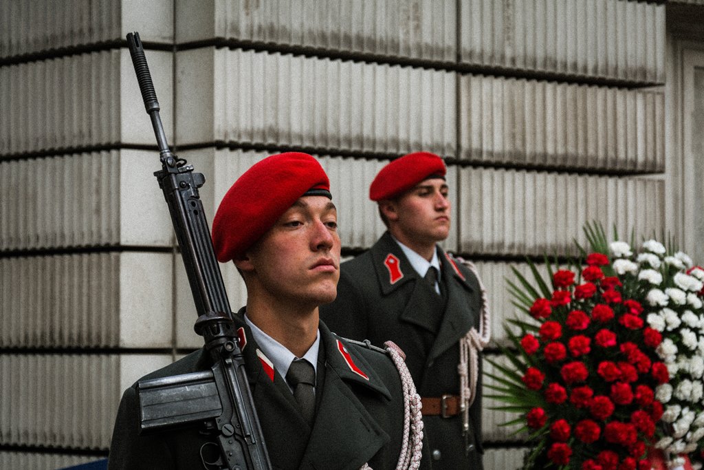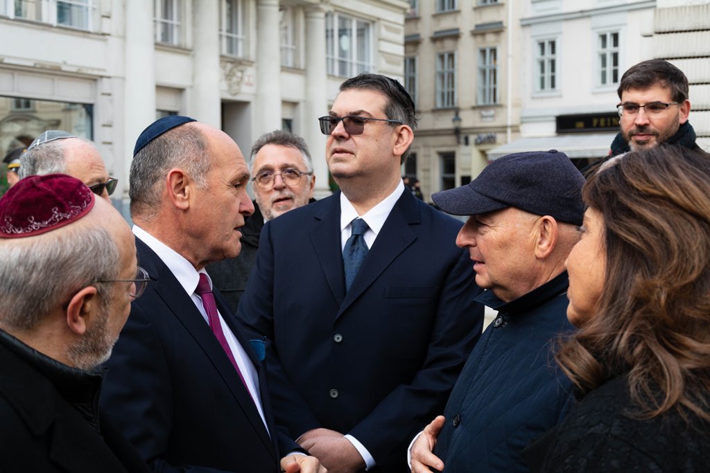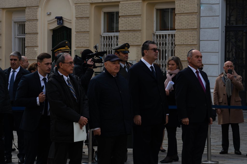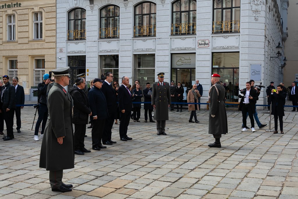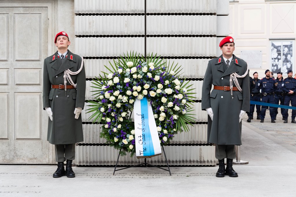 Anlässlich des 83. Jahrestages der Novemberpogrome legte Nationalratspräsident Wolfgang Sobotka, in Vertretung von Bundespräsident Alexander Van der Bellen, beim Mahnmal für die Opfer der Shoa am Judenplatz einen Kranz nieder. Die Garde unterstützte mit Ehrendiensten und einem Trompeter. (Foto: Bundesheer/Garde)
