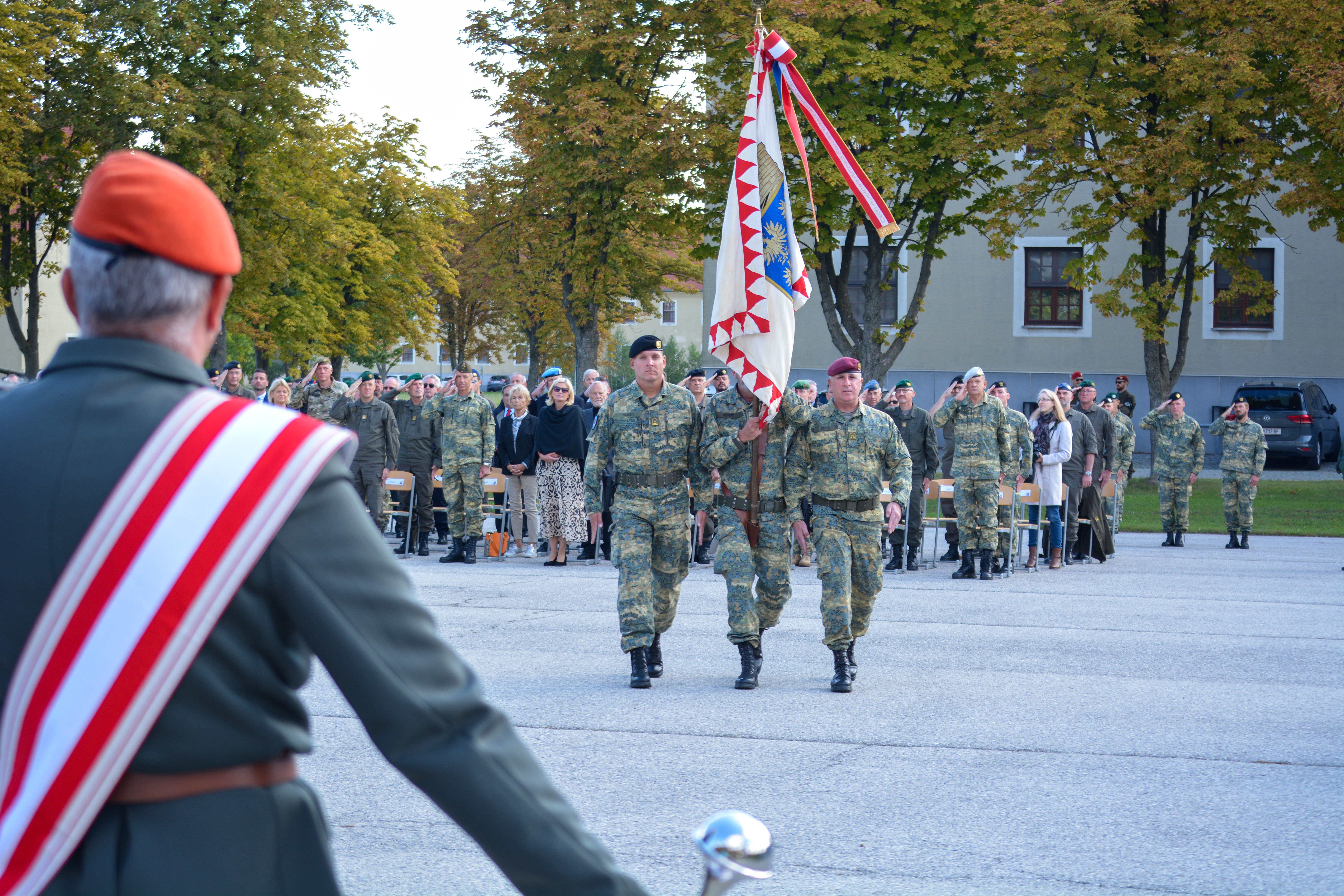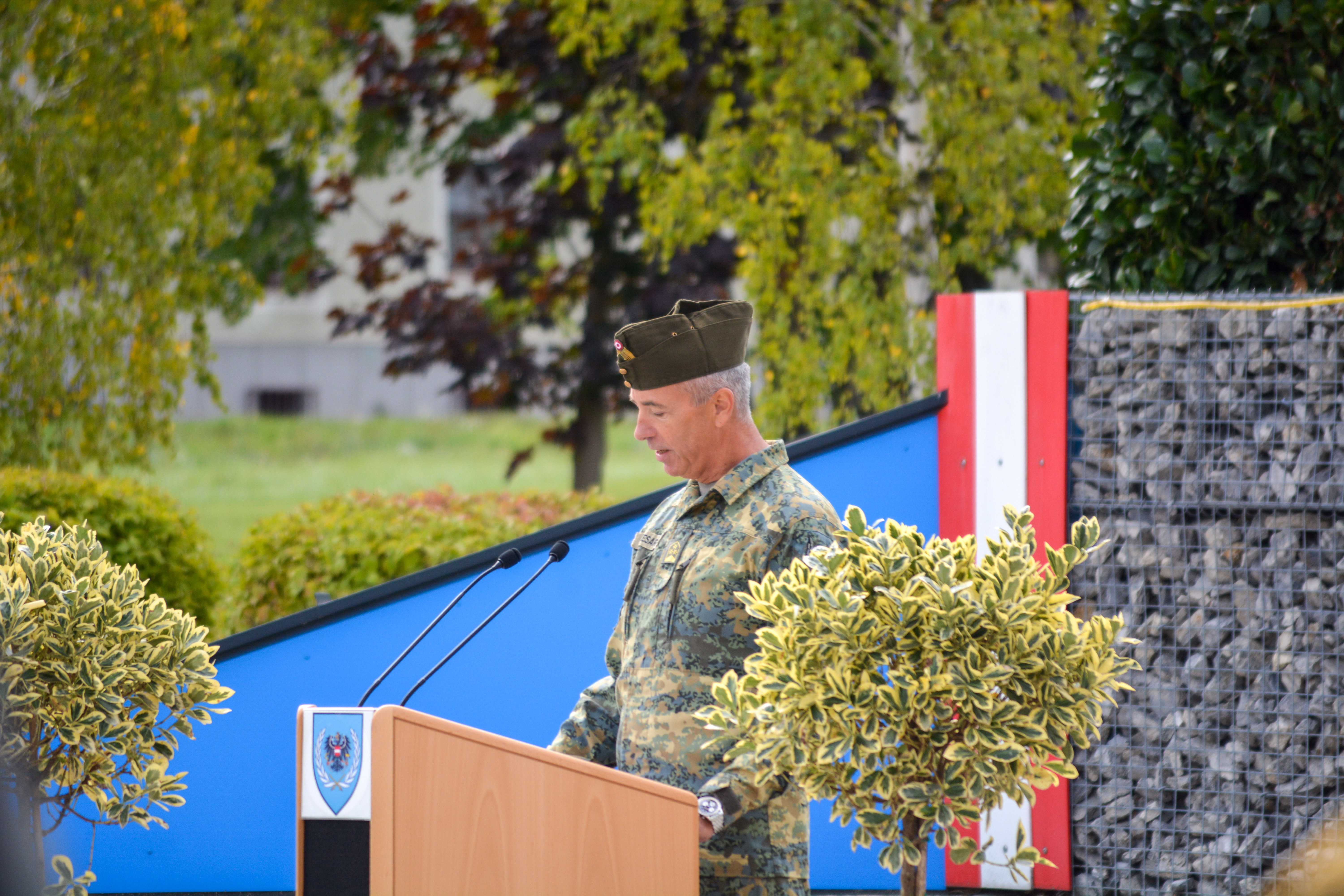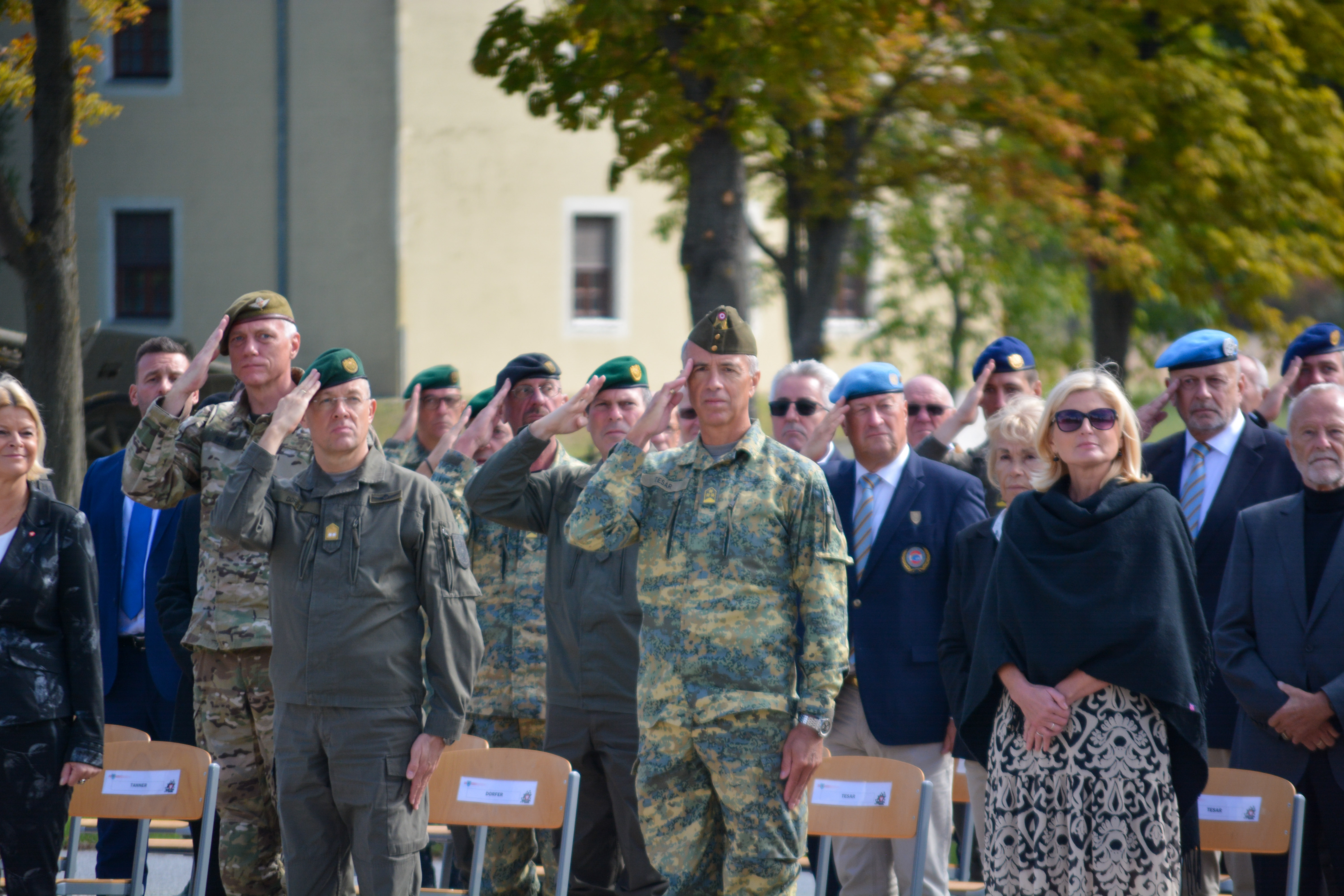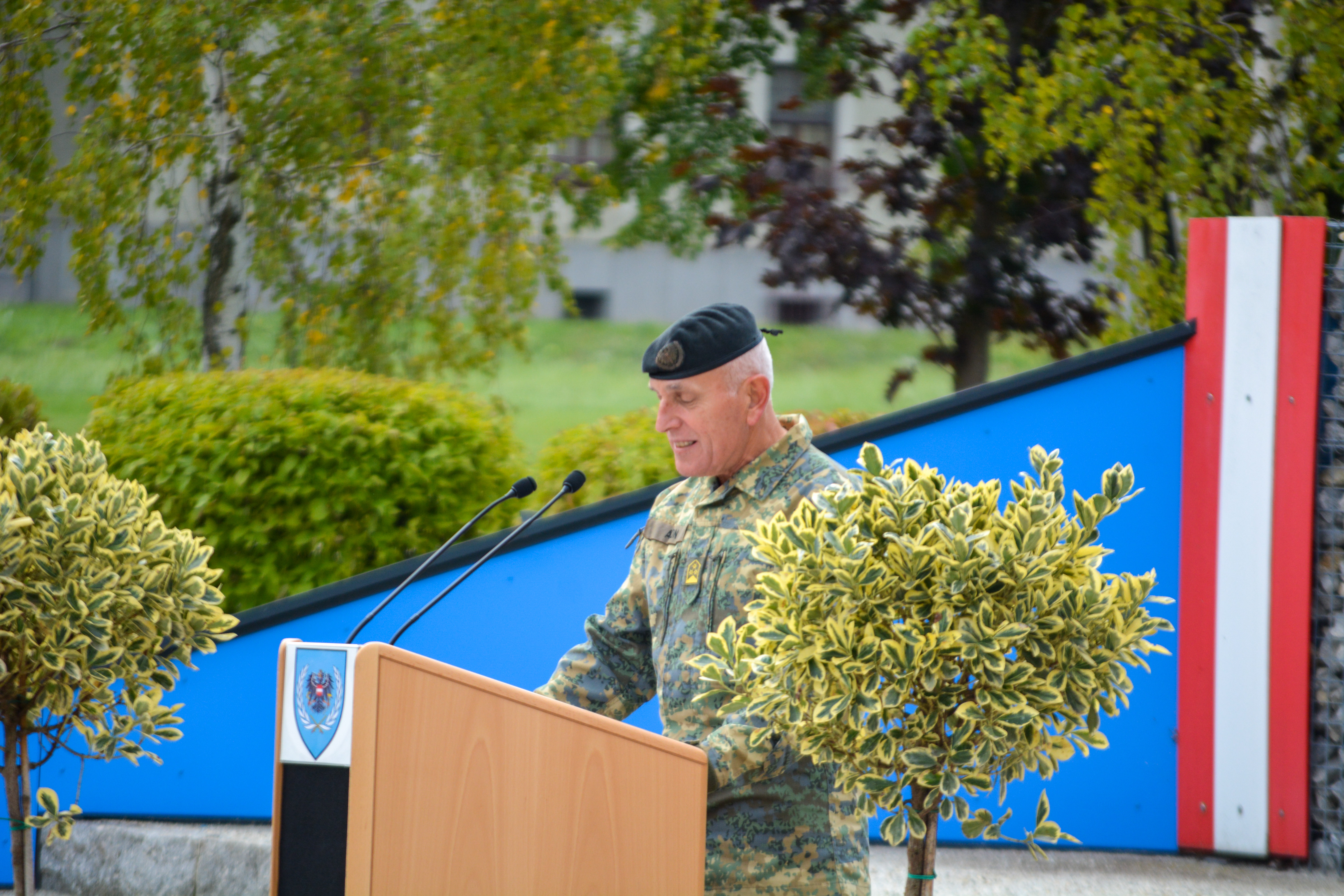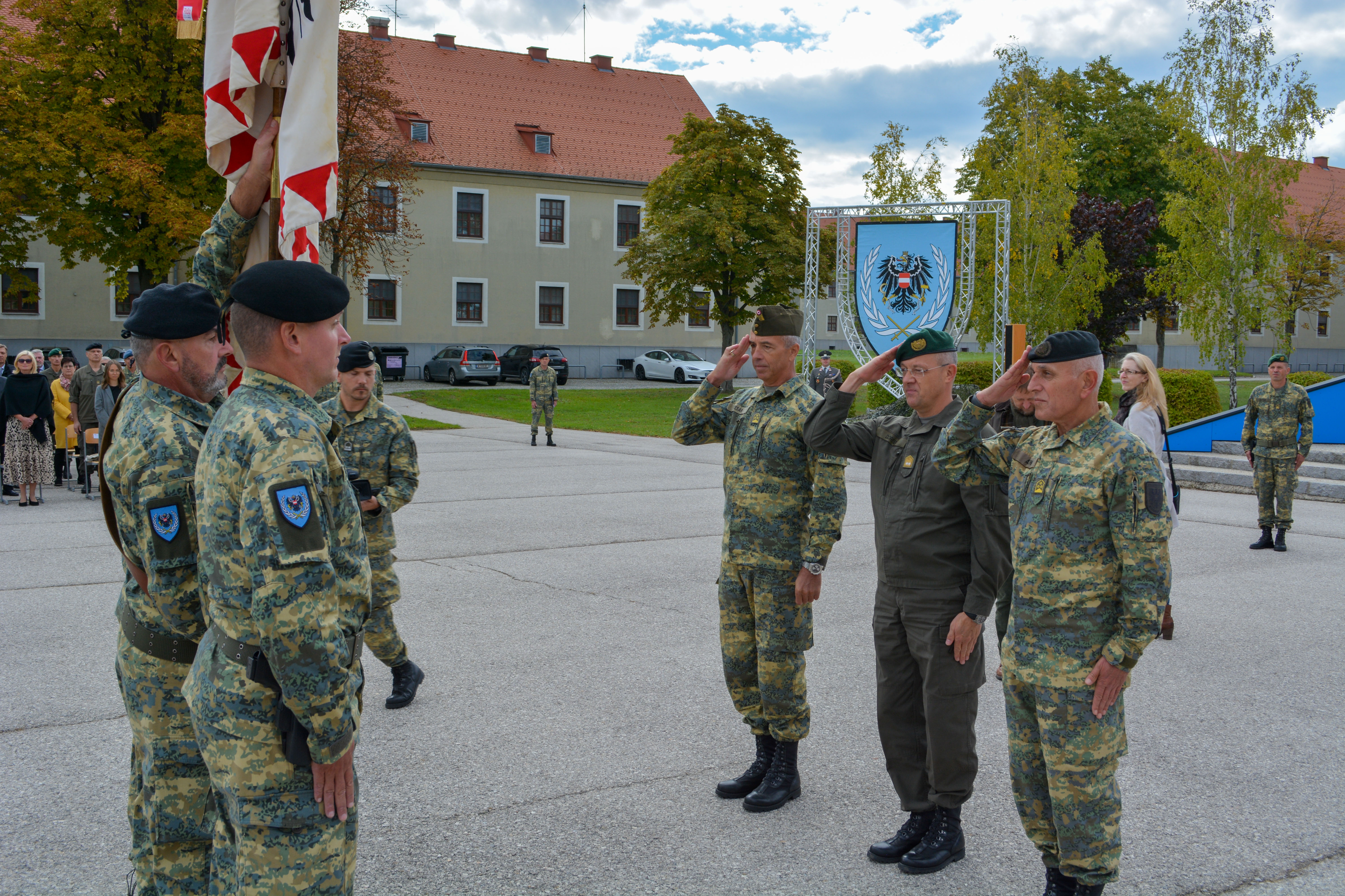 Als sichtbares Zeichen der Kommandoübernahme übergab am Donnerstag, den 22. September 2022 in der Wallenstein Kaserne in Götzendorf, Generalmajor Martin Dorfer, Leiter der Direktion 1 – Einsatz, bei einem militärischen Festakt die Insignie der Auslandseinsatzbasis von Oberst Claus Amon an Oberst des Generalstabsdienstes Christian Tesar. Neben Verteidigungsministerin Klaudia Tanner nahmen zahlreiche weitere Fest- und Ehrengäste an der Veranstaltung teil. Die 3. Gardekompanie stellte die Ehrenkompanie gemeinsam mit der Gardemusik Wien.