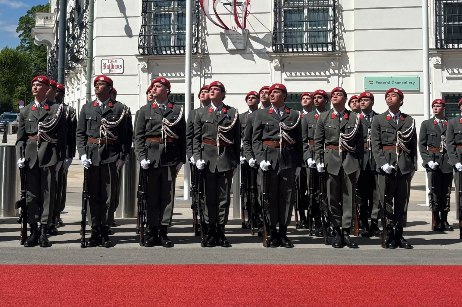 Vergangenen Mittwoch empfing Bundeskanzler Christian Stocker den Premierminister der Republik Nordmazedonien, Hristijan Mickoski zu einem offiziellen Besuch. Empfang mit militärischen Ehren am Ballhausplatz in Wien. Die 3. Gardekompanie stellte gemeinsam mit der Militärmusik Burgenland die Ehrenformation