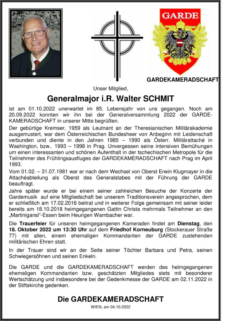 06. Oktober 2022 | Garde Traueranzeige GenMjr iR Walter Schmit Traueranzeige für GenMjr i.R. Walter SCHMIT