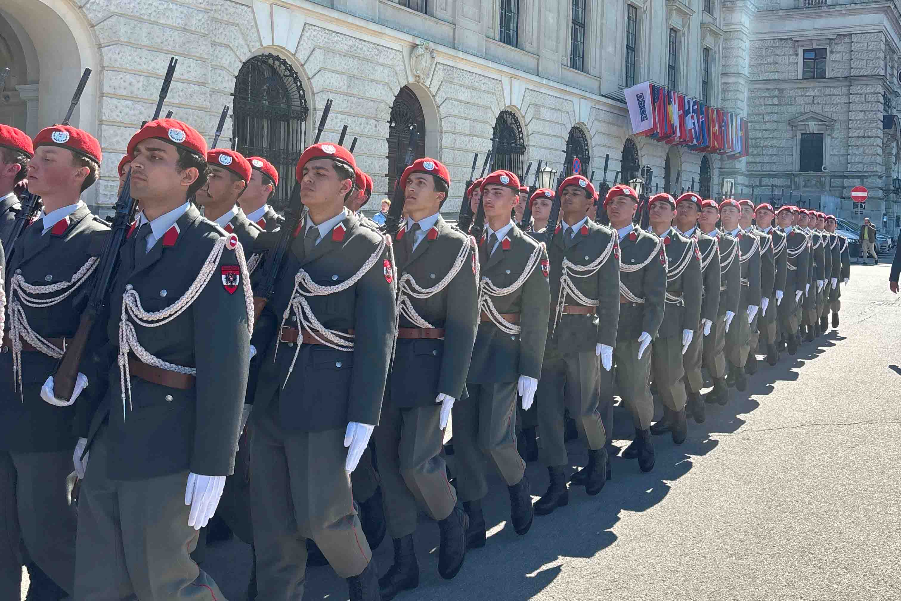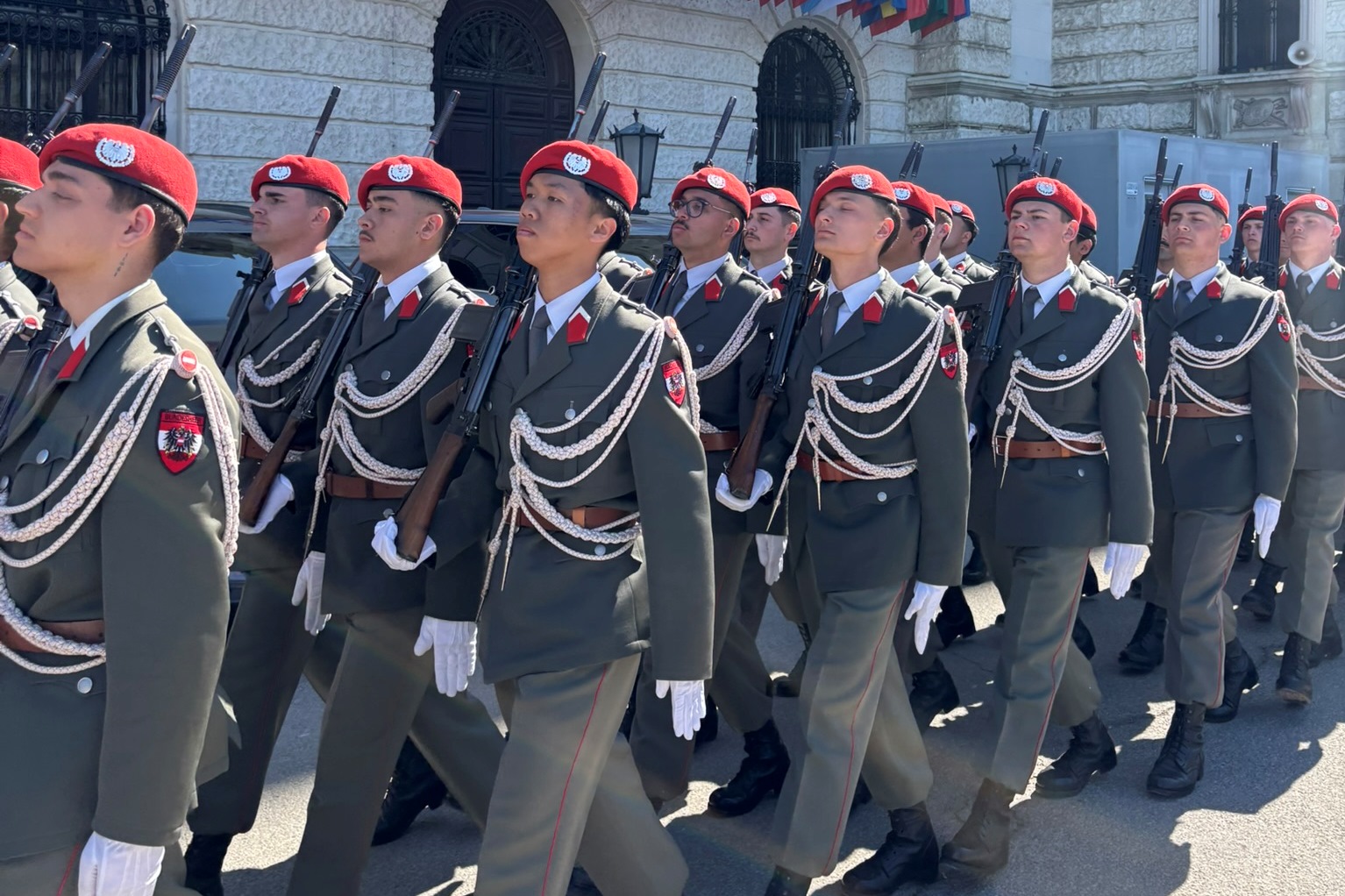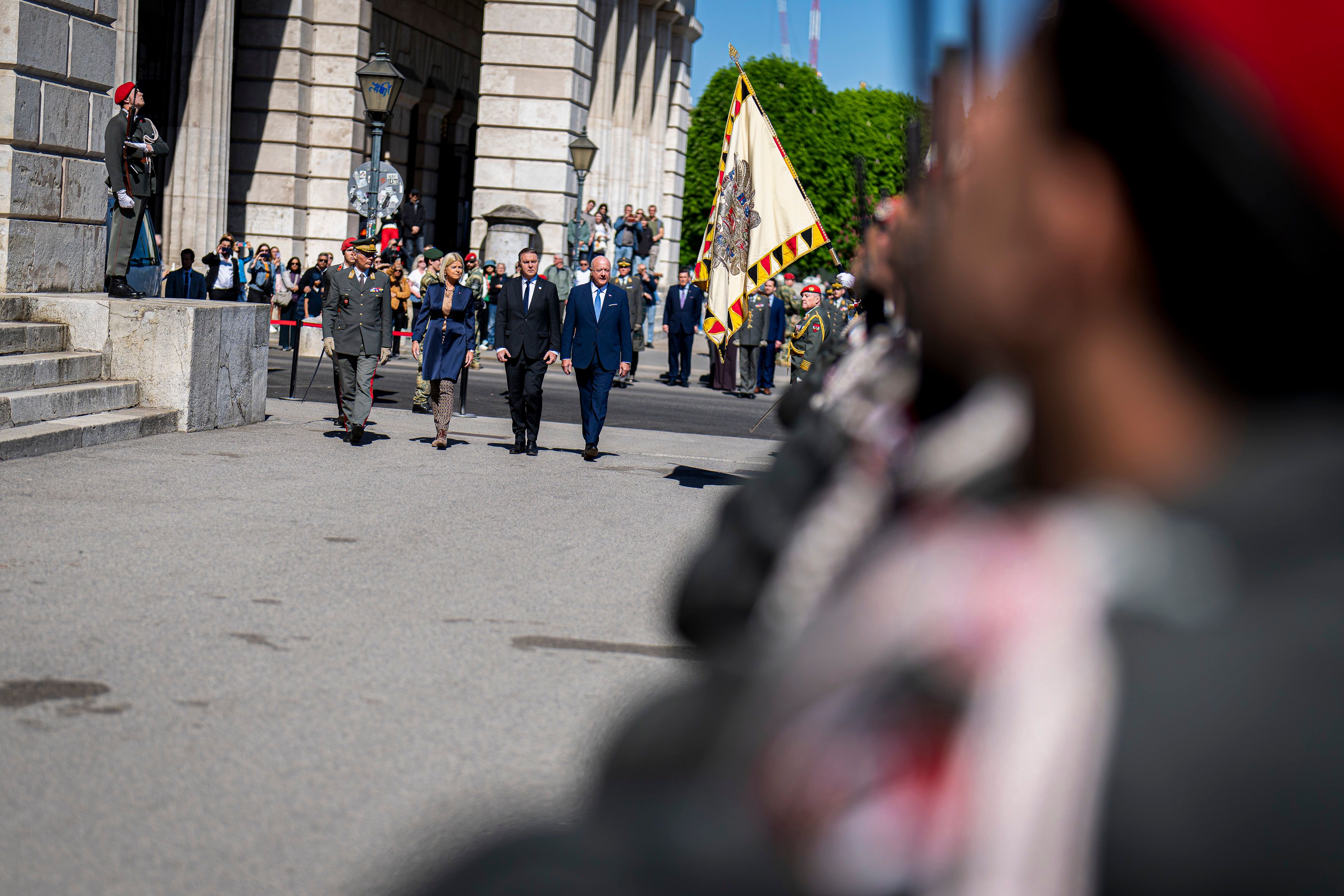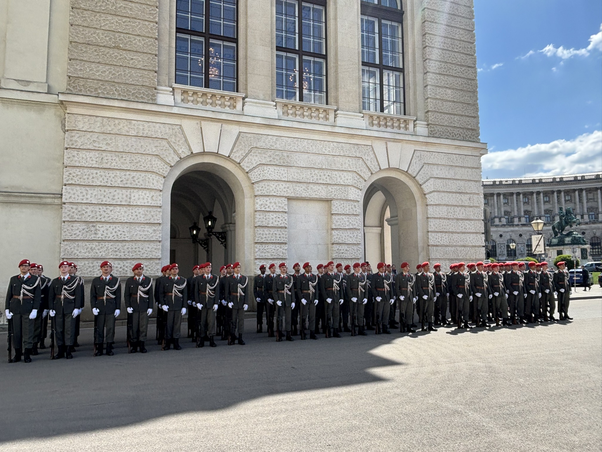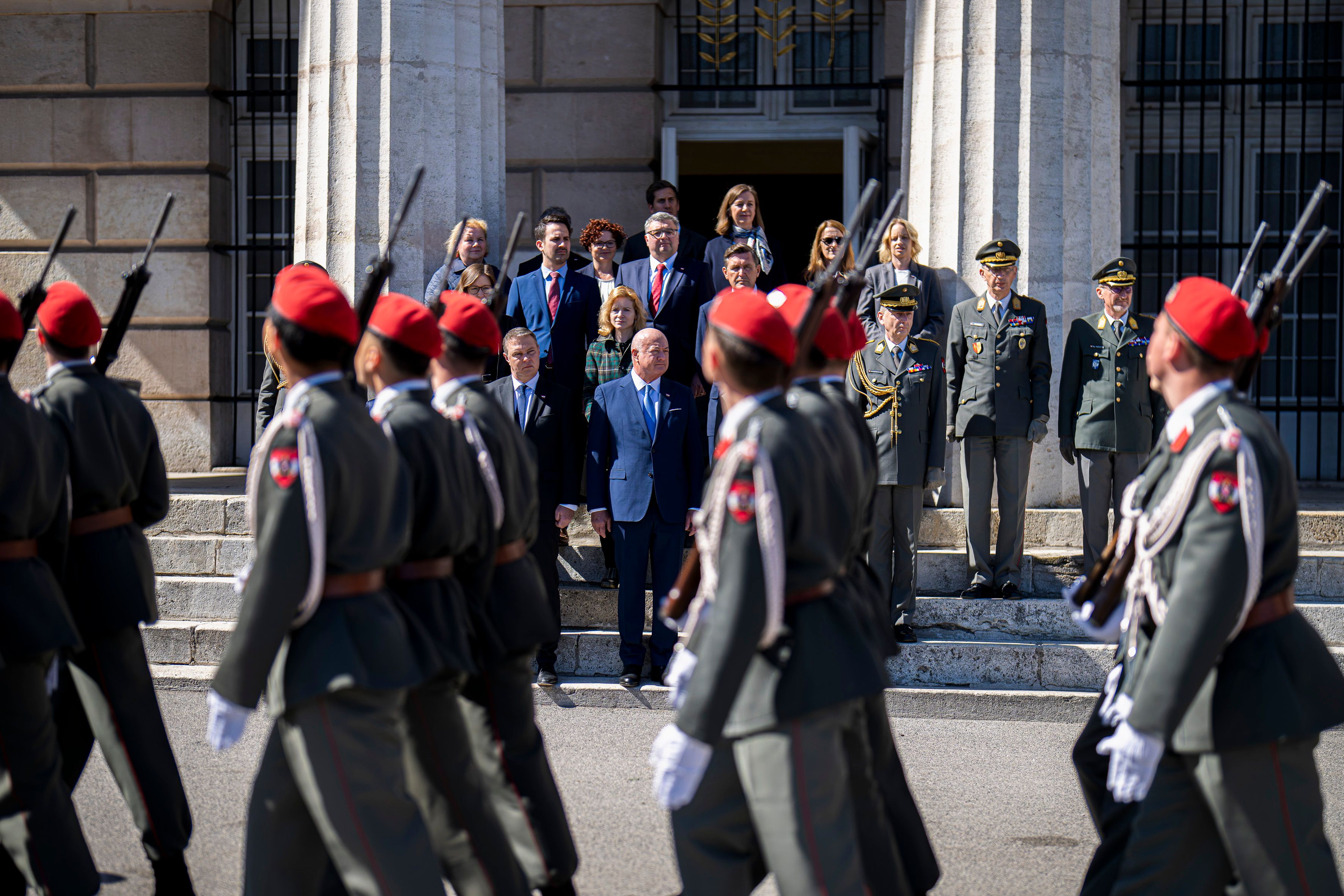 Der Empfang mit militärischen Ehren im „Inneren Burghof“ erfolgte durch die 2. Gardekompanie und der Gardemusik Wien.