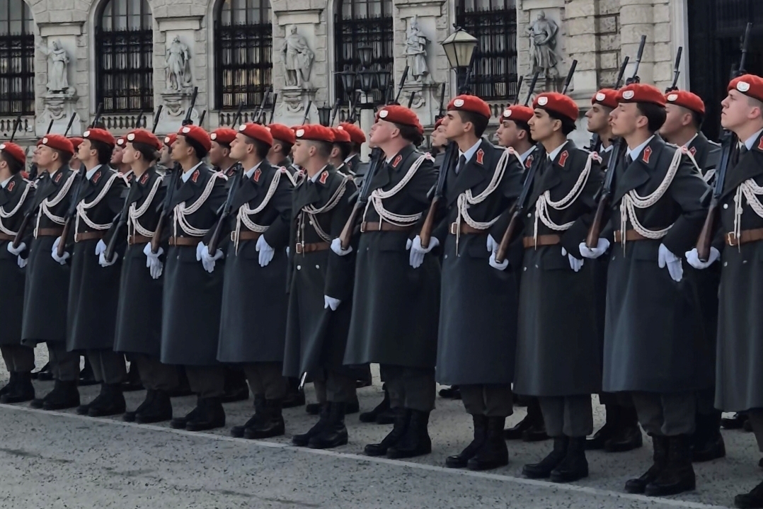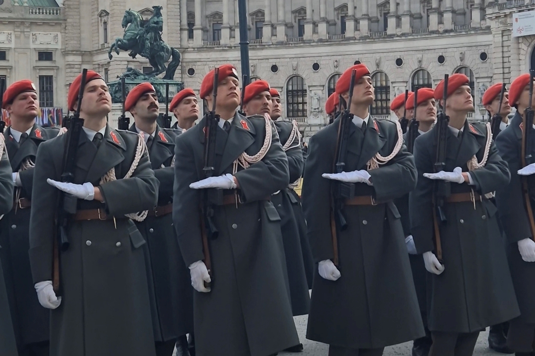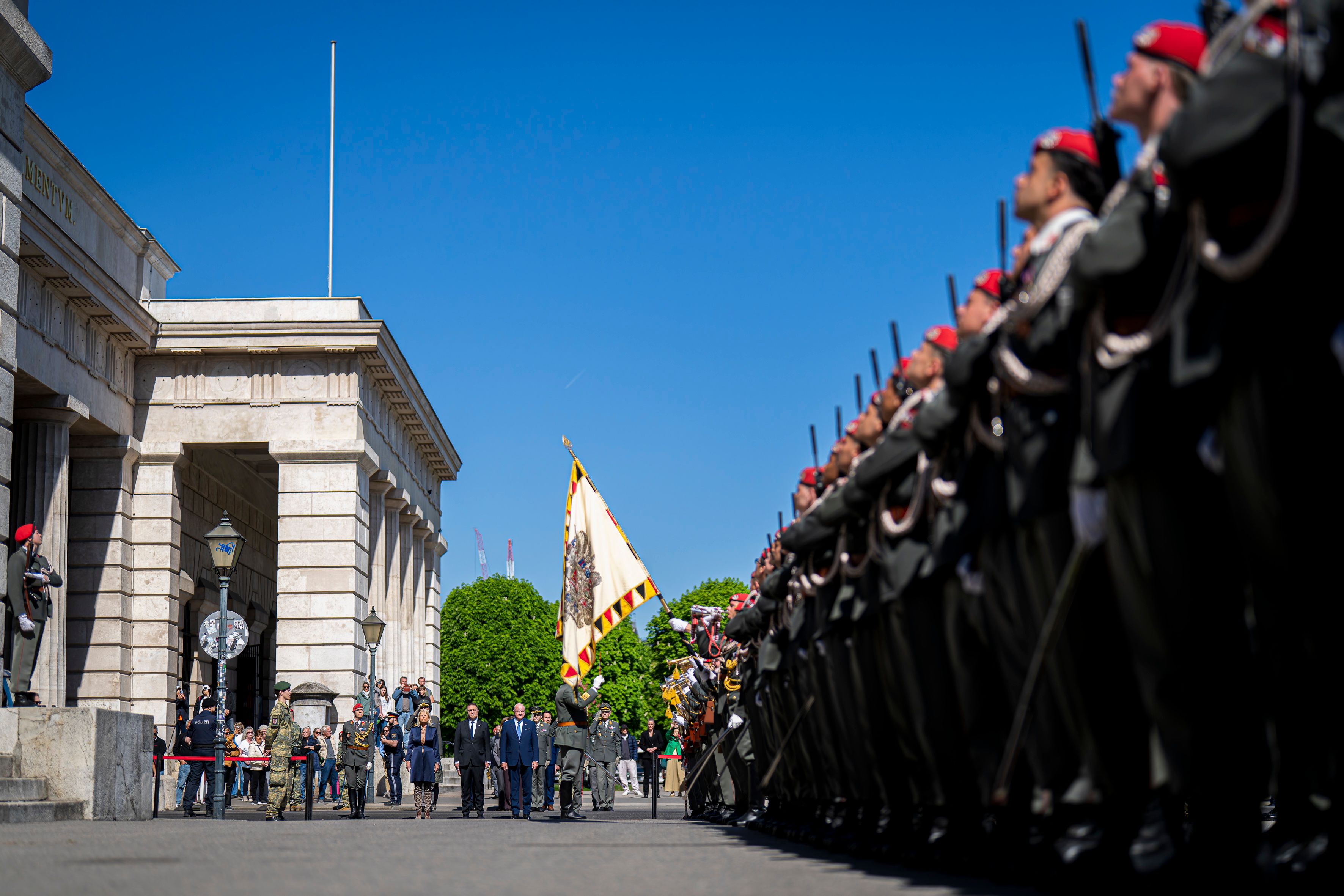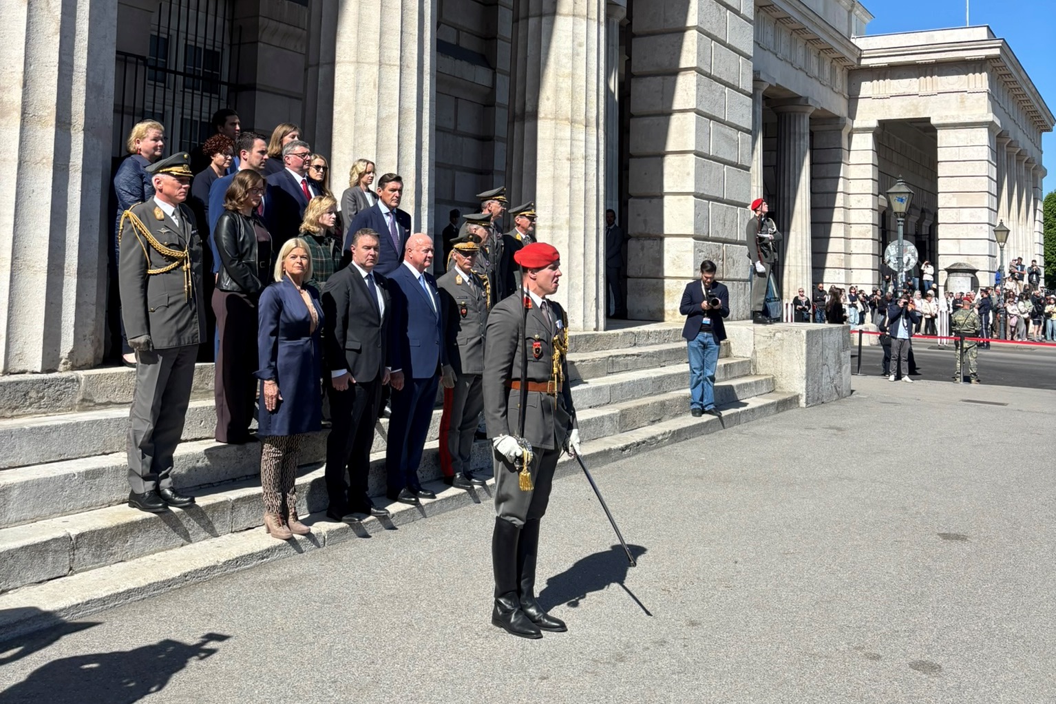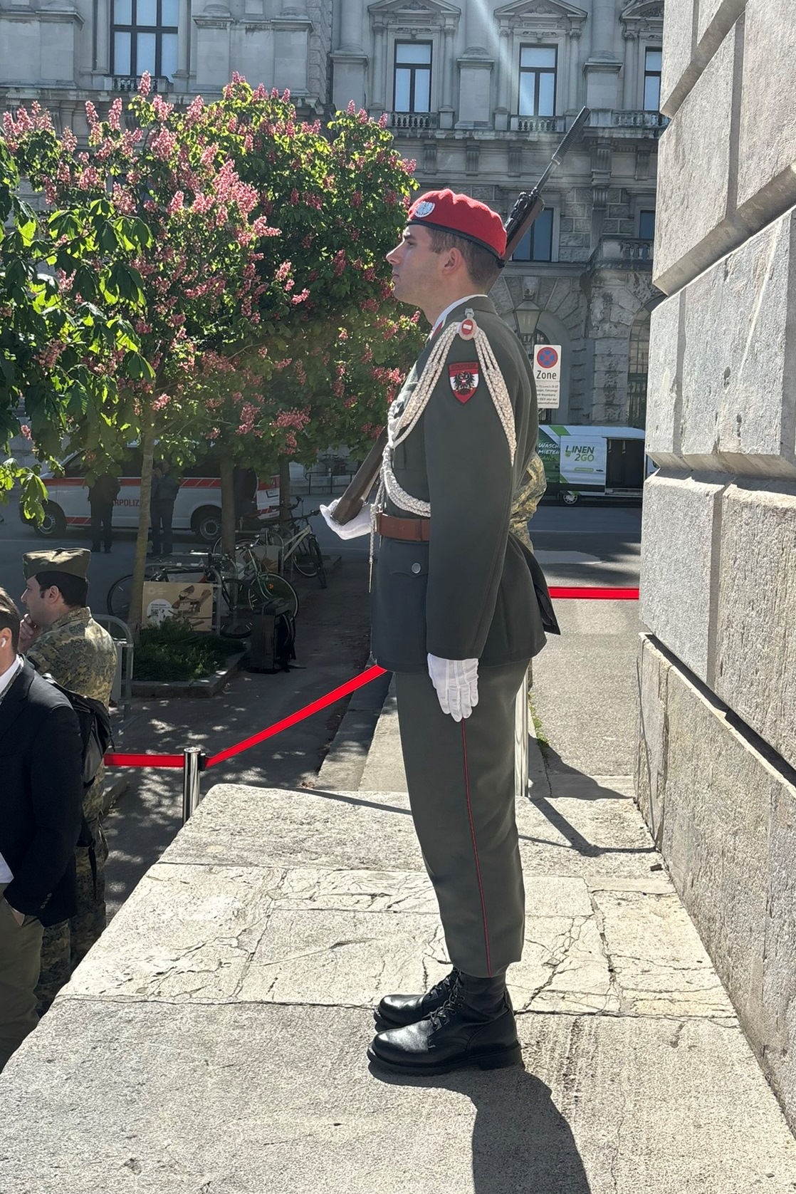 Der Empfang mit militärischen Ehren im „Inneren Burghof“ erfolgte durch die 2. Gardekompanie und der Gardemusik Wien.