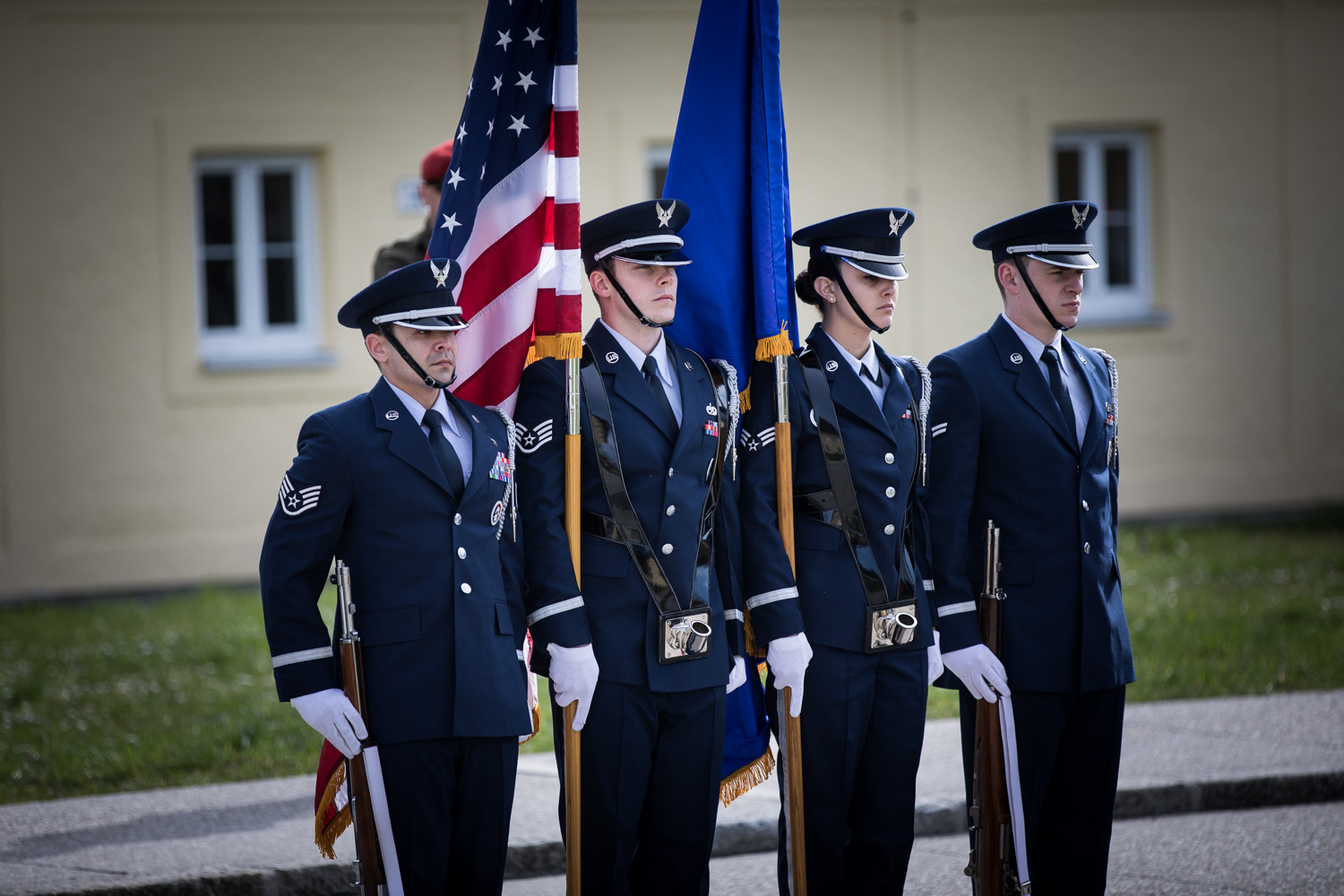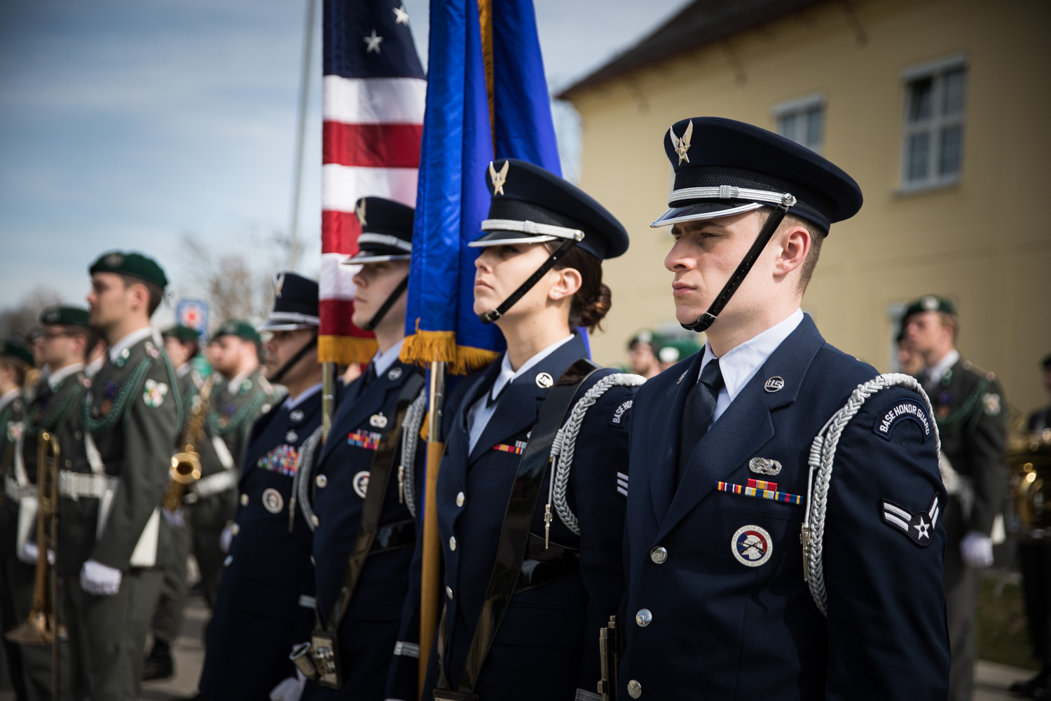 Der 93-jährige Harry Stewart am Fliegerhorst Vogler ein Mahnmal zu Ehren seines Fliegerkameraden Lieutenant Walter P. Manning. Mit dabei, bei dieser Gedenkveranstaltung eine Ehrenkompanie der Garde