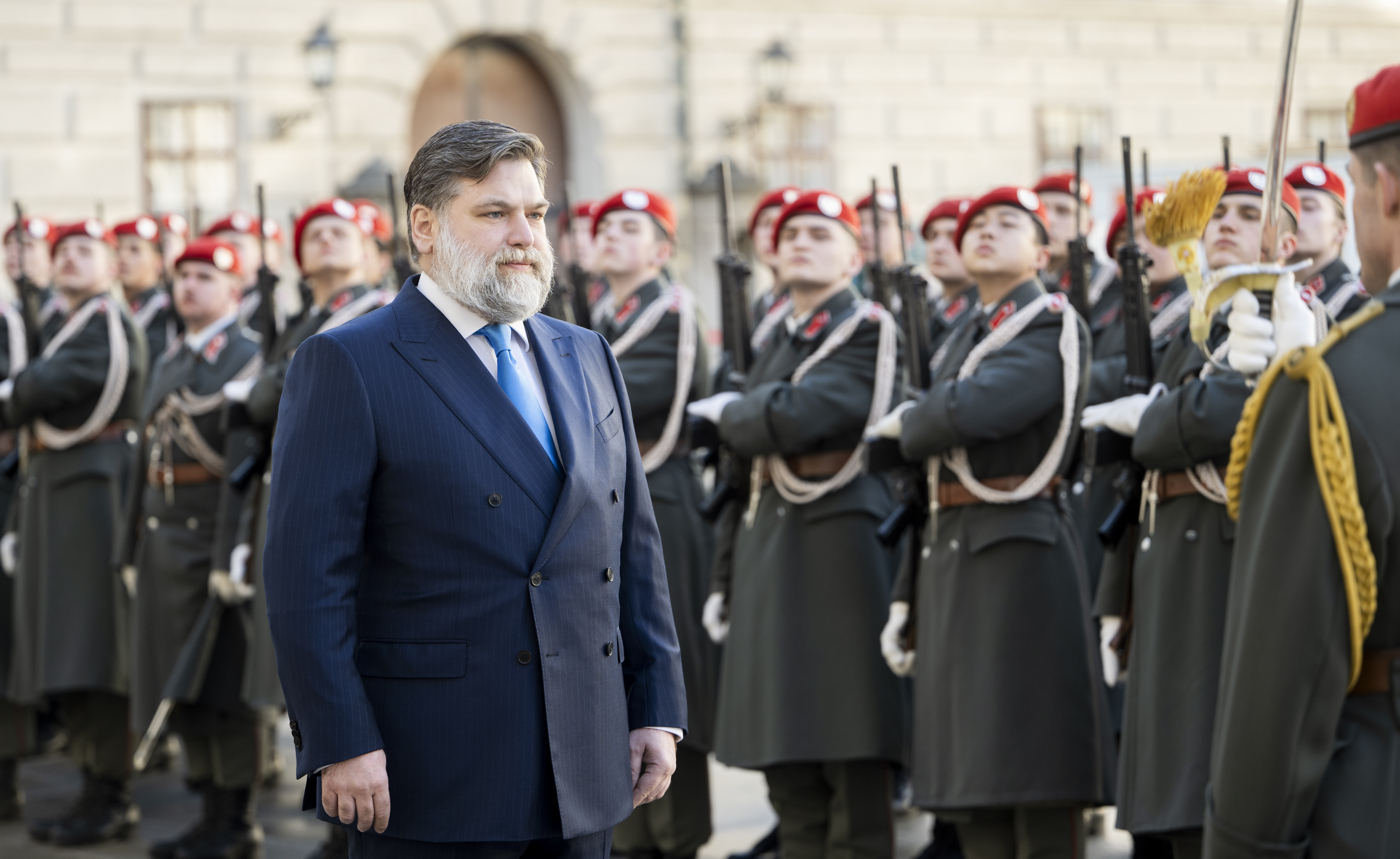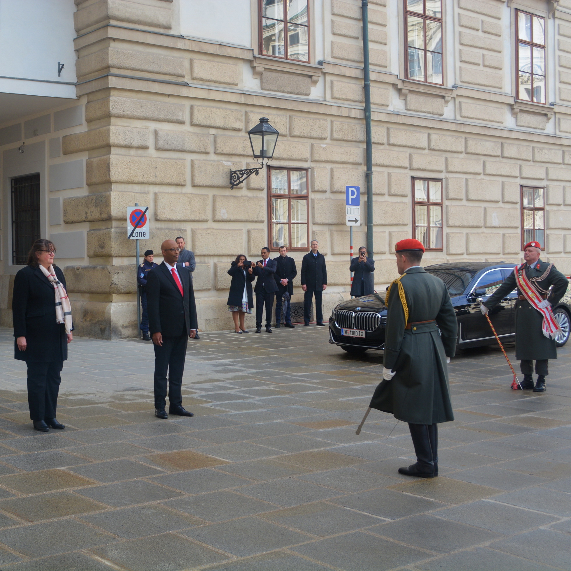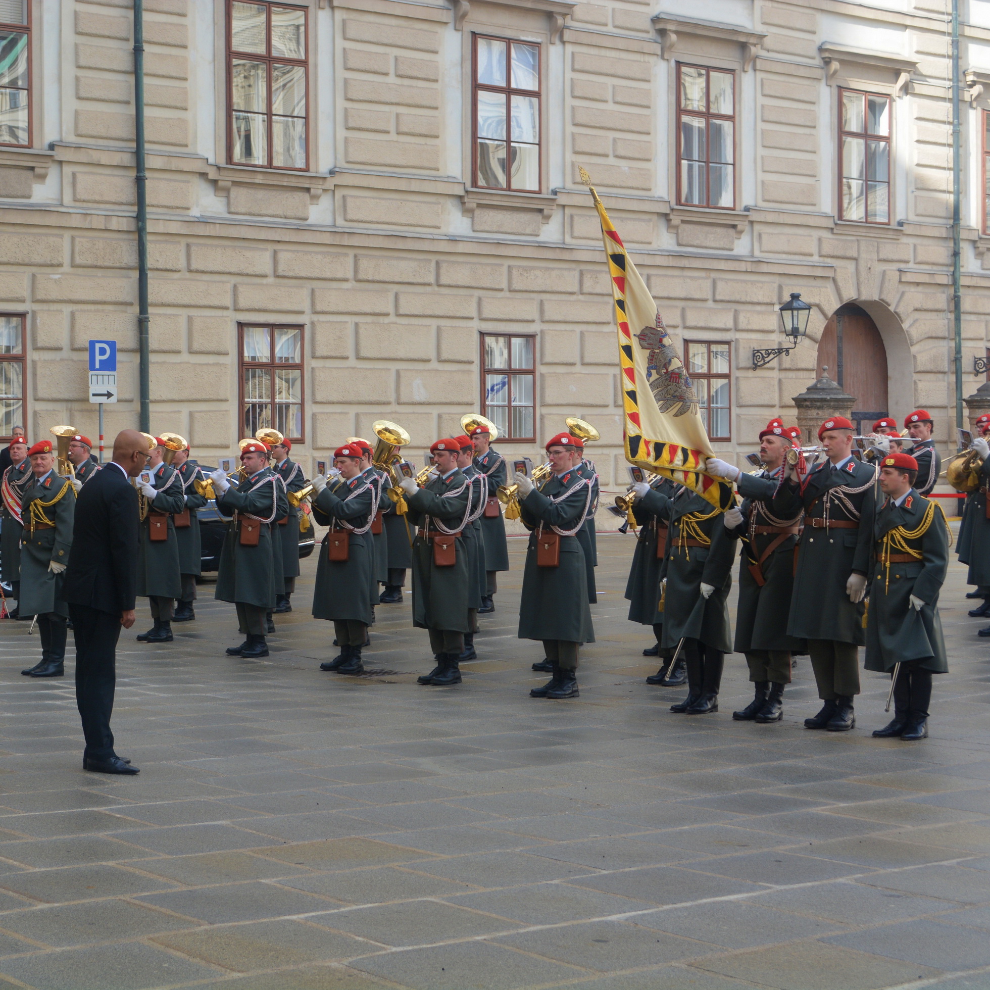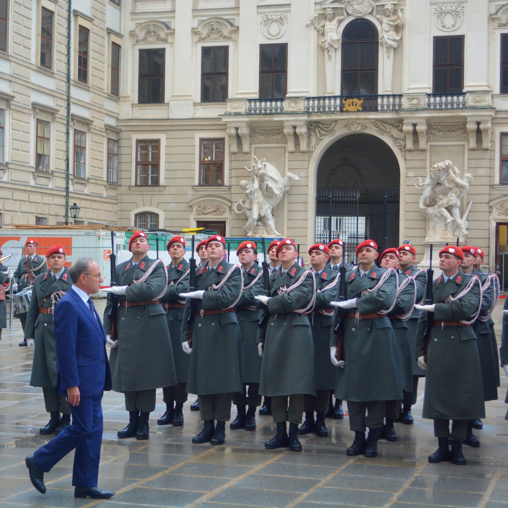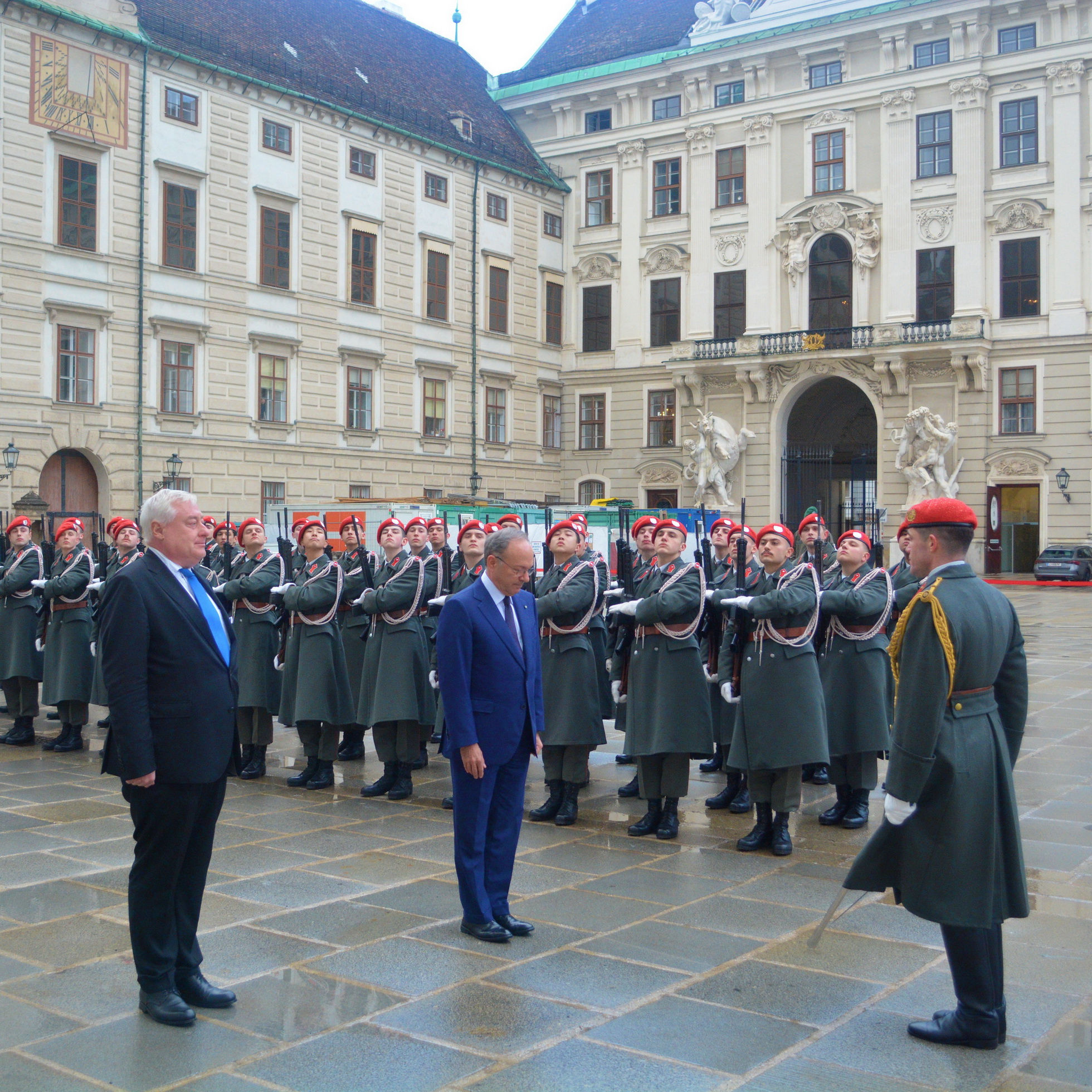 Der Empfang mit militärischen Ehren im „Inneren Burghof“ erfolgte durch die 3. Gardekompanie und der Gardemusik Wien.